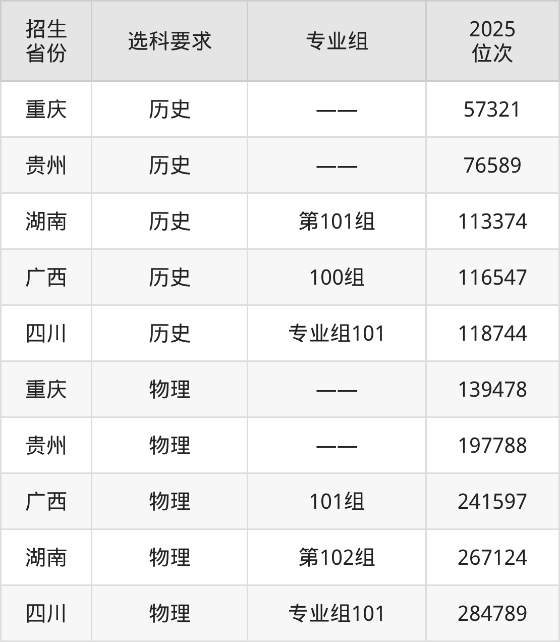 贵州财经职业学院2025年在全国各省的位次差异较大,最高位次是57321位(重庆历史类)、最低位次是284789位(四川物理类)。各省具体位次请看下图: