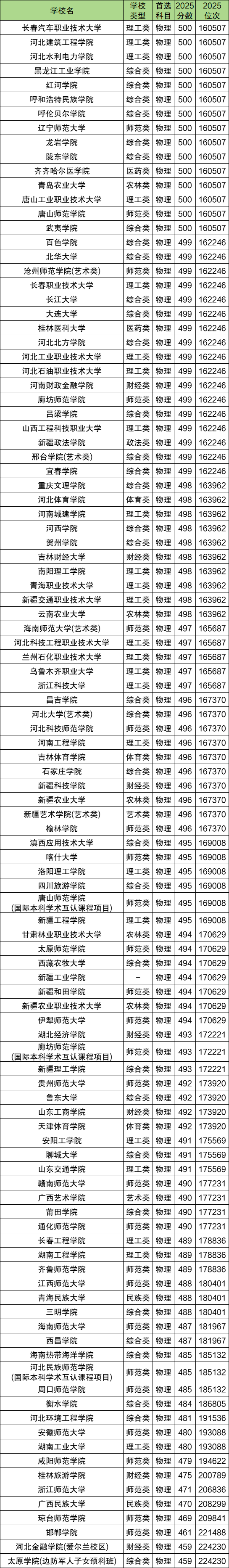 可以选择的公办本科大学中,最好的有安徽师范大学480分、大连大学499分、湖南工业大学480分、辽宁师范大学500分、云南农行也大学498分、吉林财经大学498分等,这些都属于省重点院校。该分数段最低的公办本科大学是河北金融学院(爱尔兰校区)和太原学院(边防子女预科班),2025年最低分是459分,即低于459分就只能报考专科批院校了。