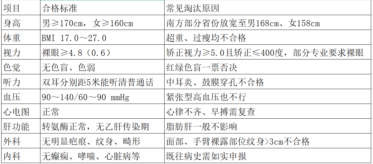 1、身高与体重:男性身高需达到170厘米及以上,女性需达到160厘米及以上。体重方面,男性BMI指数需在17.3至27.3之间,女性需在17.1至25.7之间,超标或不足均不合格。