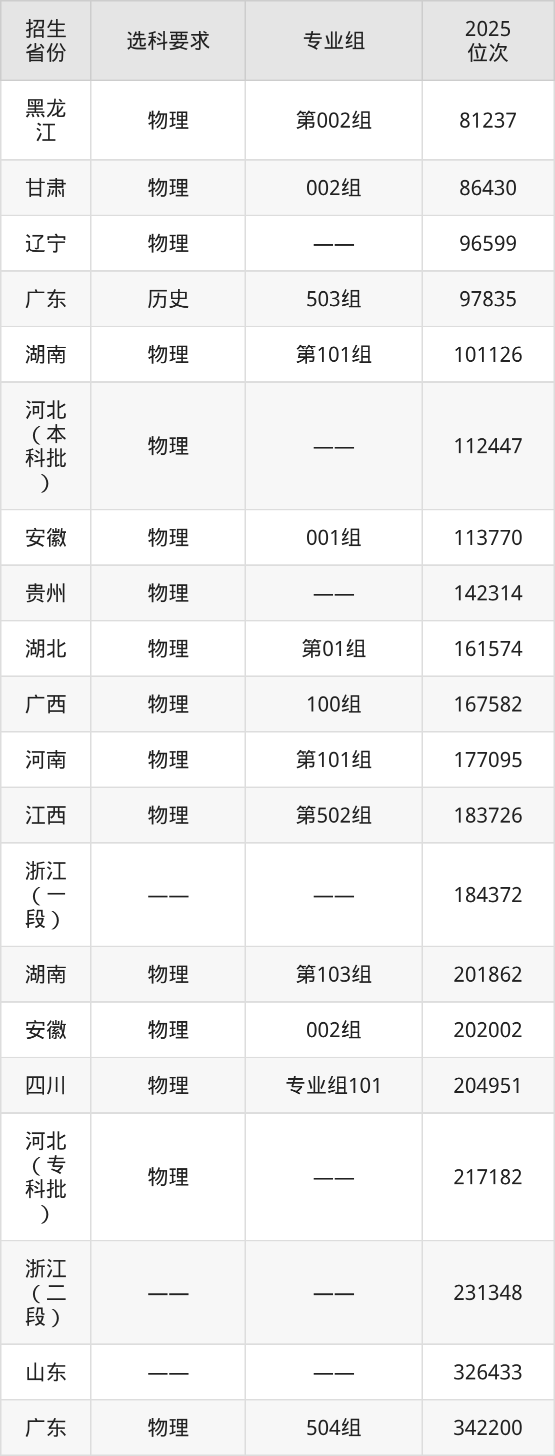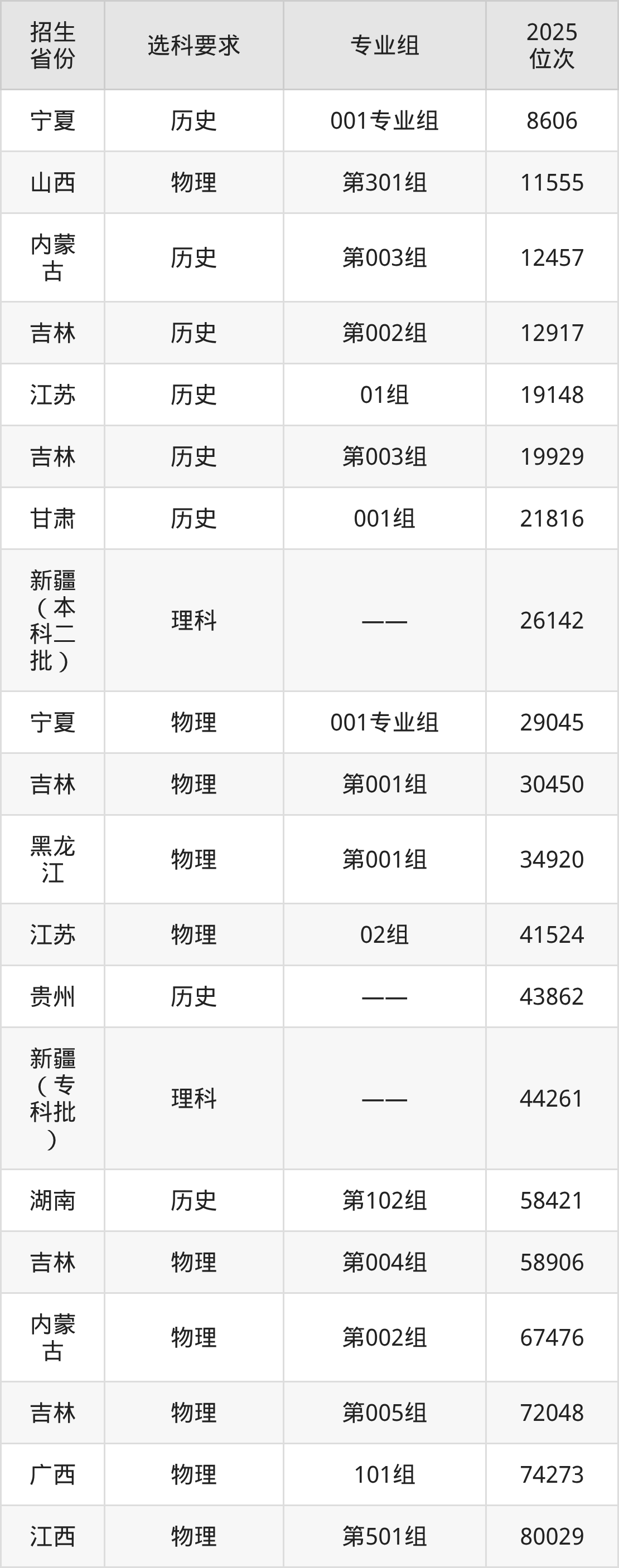 吉林铁道职业技术大学2025年在全国各省的位次差异较大,最高位次是8606位(宁夏历史类)、最低位次是342200位(广东物理类)。各省具体位次请看下图: