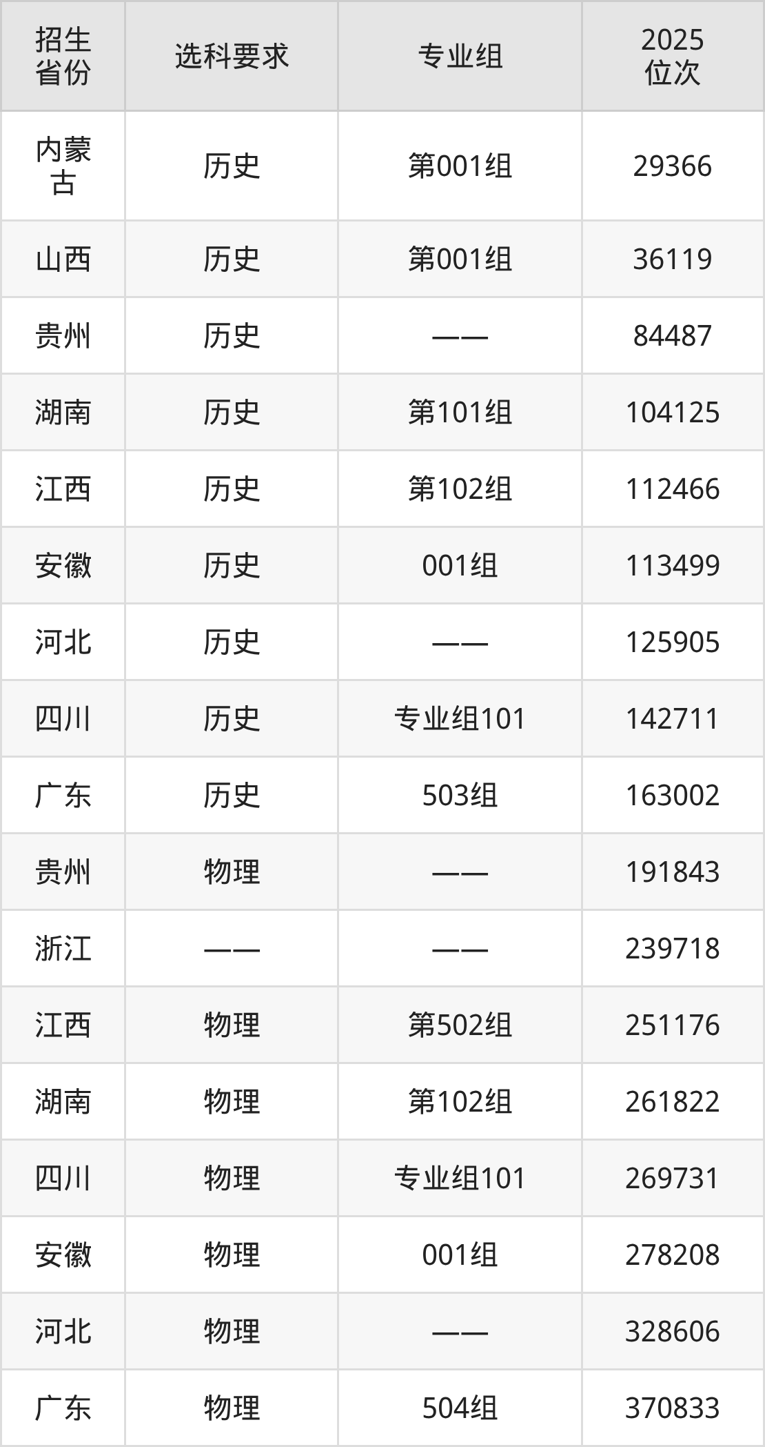 江西青年职业学院2025年在全国各省的位次差异较大,最高位次是29366位(内蒙古历史类)、最低位次是370833位(广东物理类)。各省具体位次请看下图: