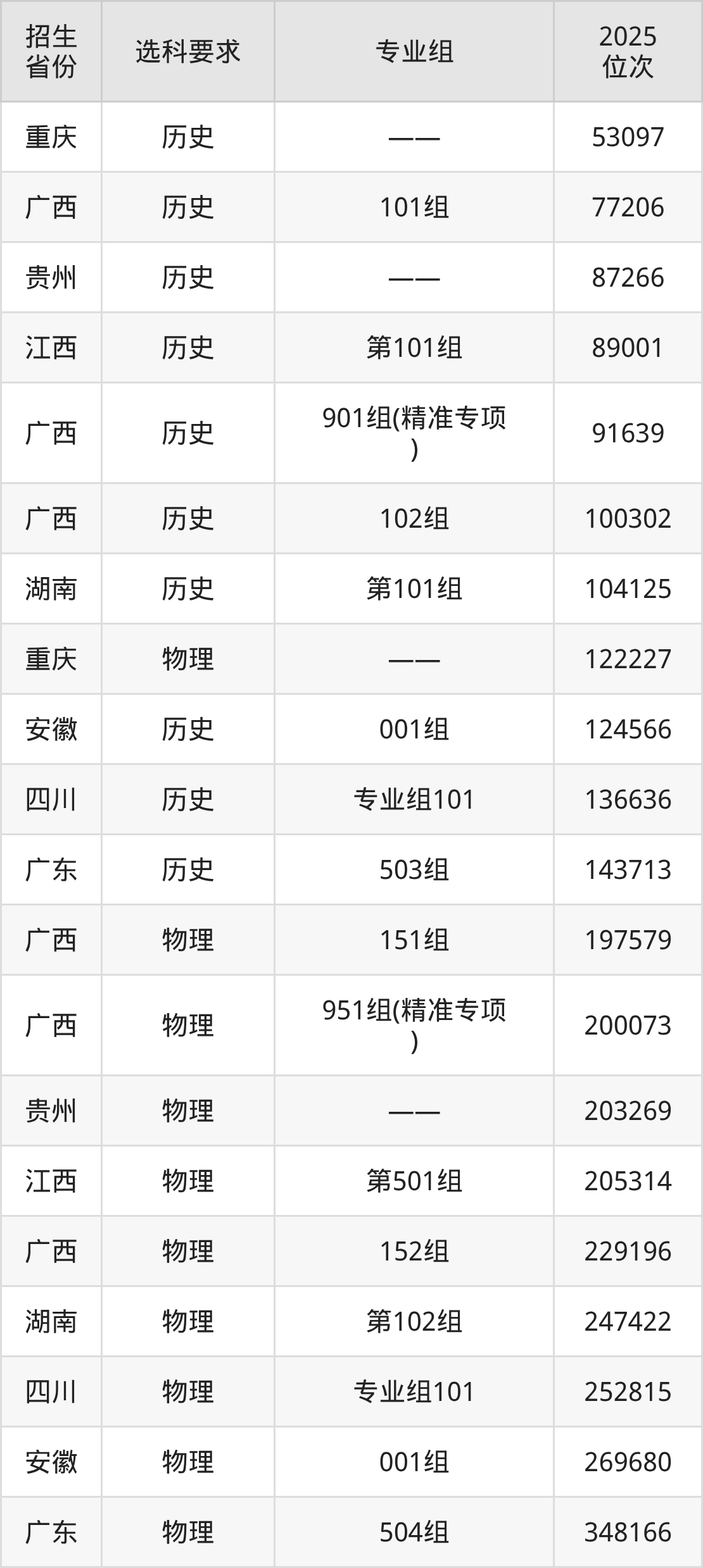 广西工业职业技术学院2025年在全国各省的位次差异较大,最高位次是53097位(重庆历史类)、最低位次是453371位(山东)。各省具体位次请看下图: