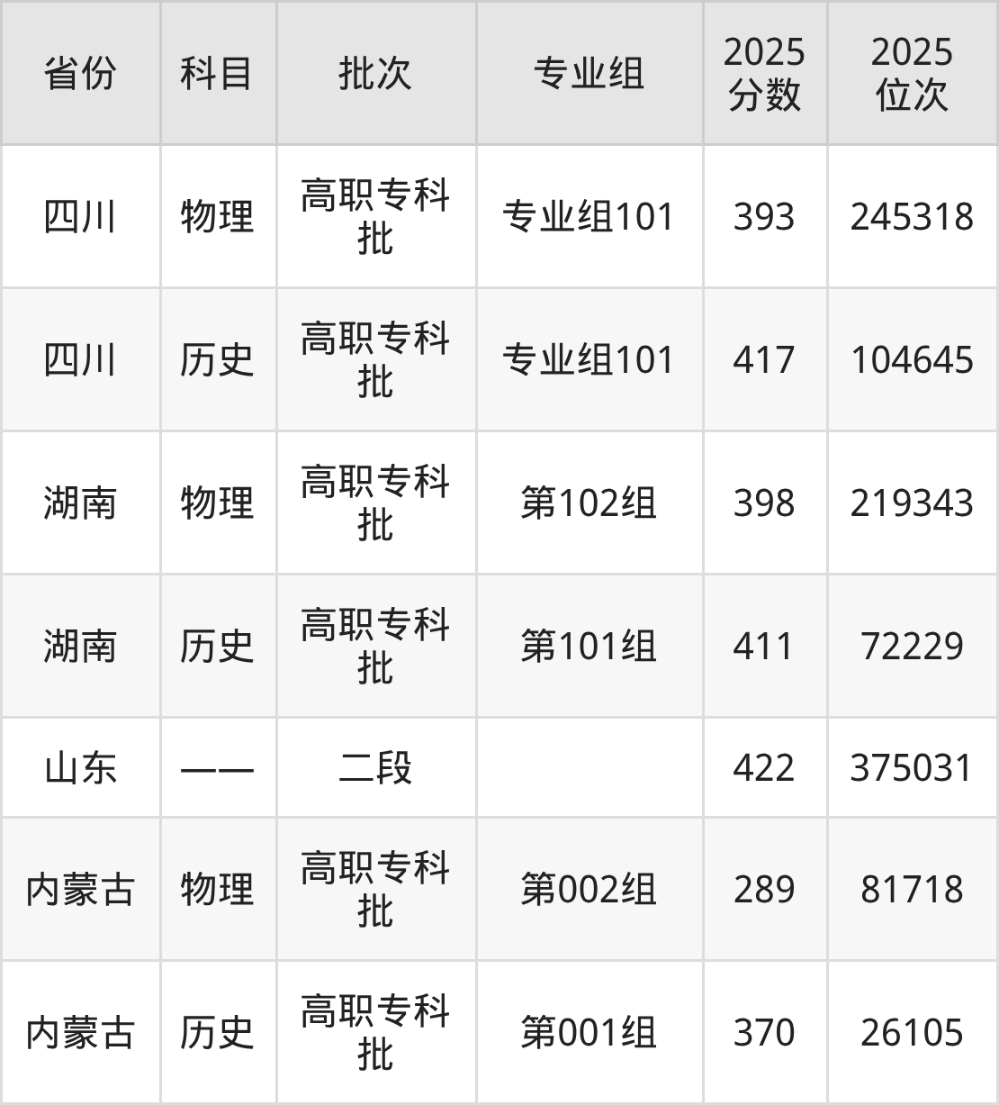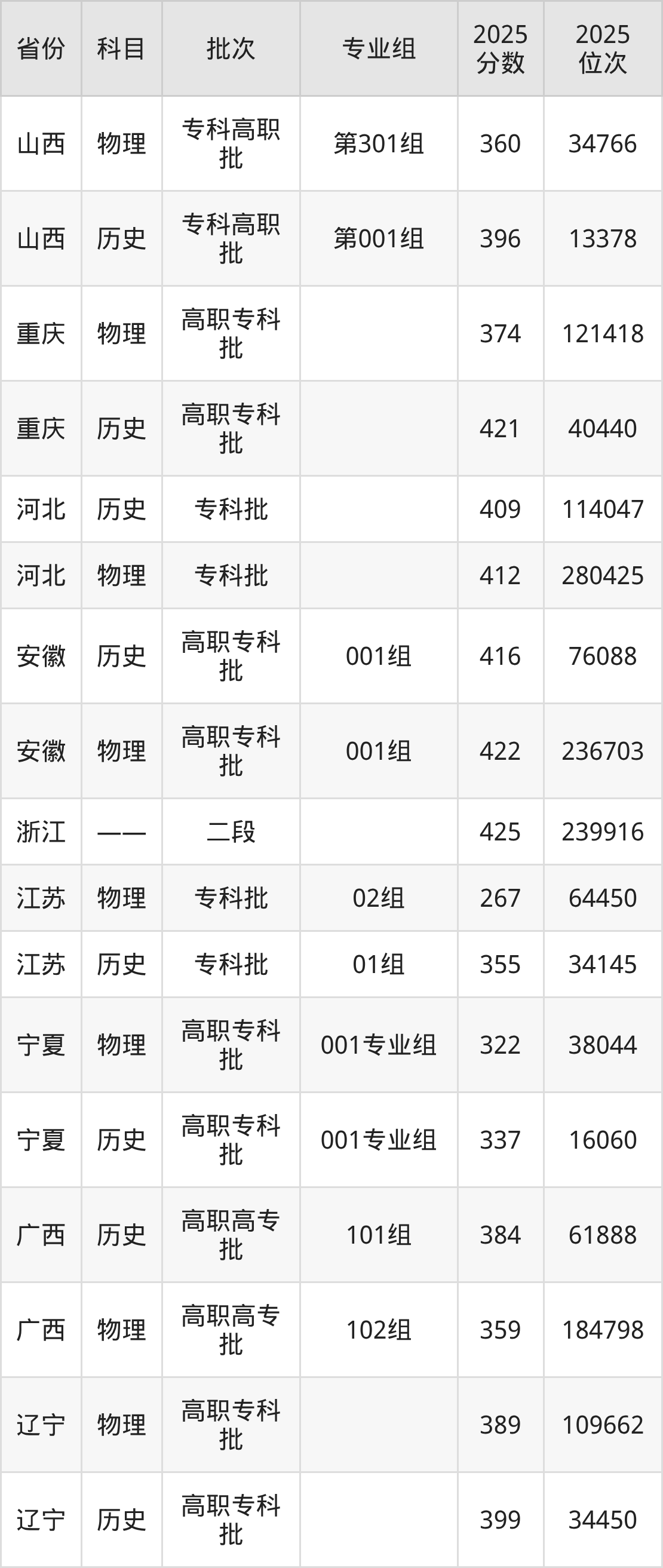 普通类专科物理类最低393分,专科历史类最低417分