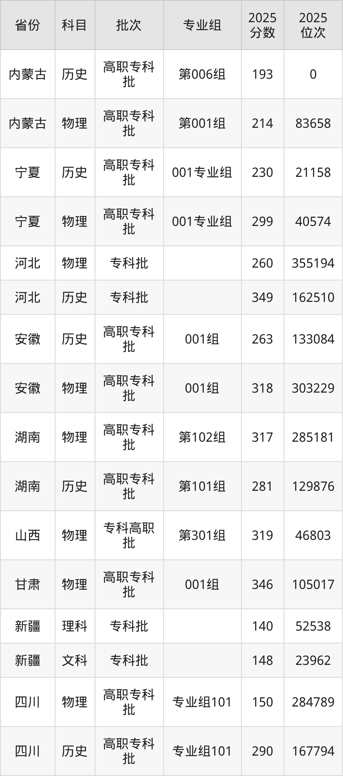 阿拉善职业技术学院第006组:2025年投档录取最低分为193分,录取最低位次为0名。