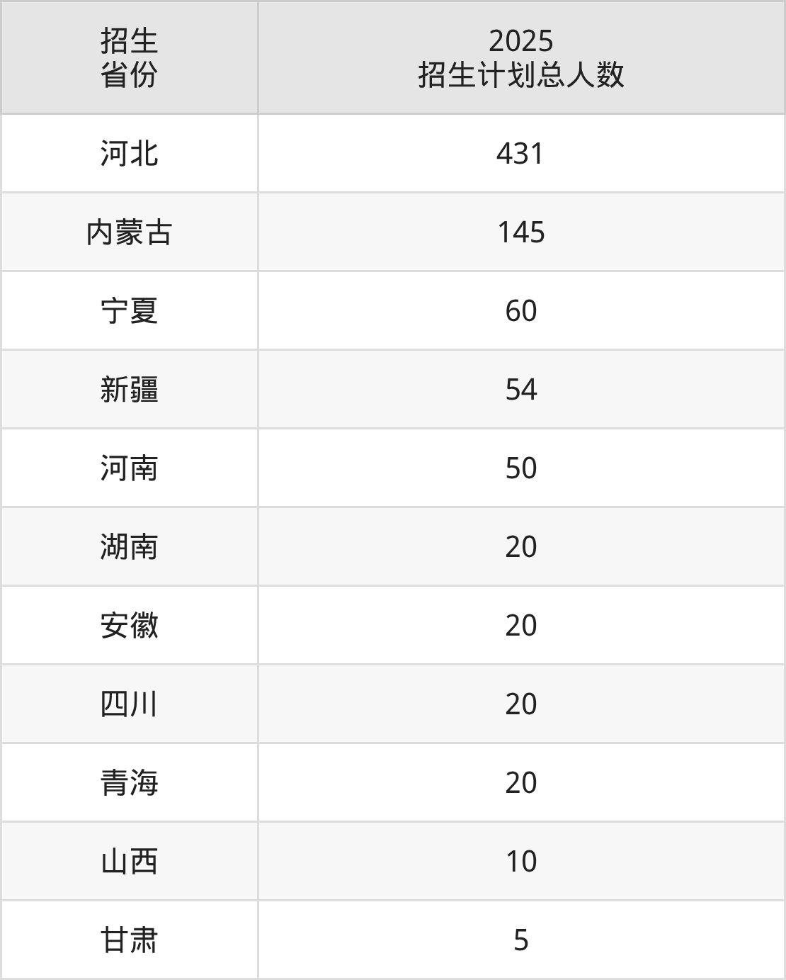 2025年阿拉善职业技术学院面向全国11个省市开展专科招生;招生专业共17个,招生人数共835人。2025年在内蒙古自治区招生计划总人数是145人,其中,阿拉善职业技术学院在内蒙古自治区招生人数最多的是无人机应用技术。阿拉善职业技术学院在各省具体招生人数情况如下表。
