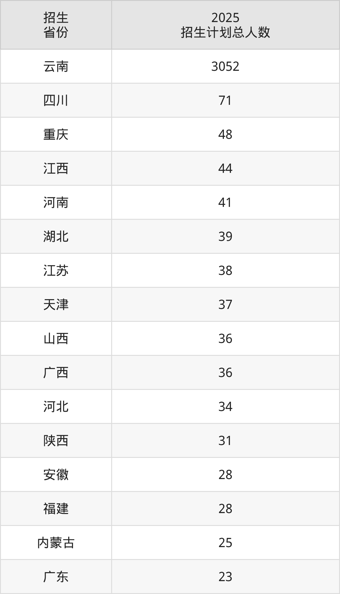 2025年昆明学院面向全国24个省市开展本科招生;招生专业共39个,招生人数共3712人。2025年在云南省招生计划总人数是3052人,其中,昆明学院在云南省招生人数最多的是土木工程。昆明学院在各省具体招生人数情况如下表。