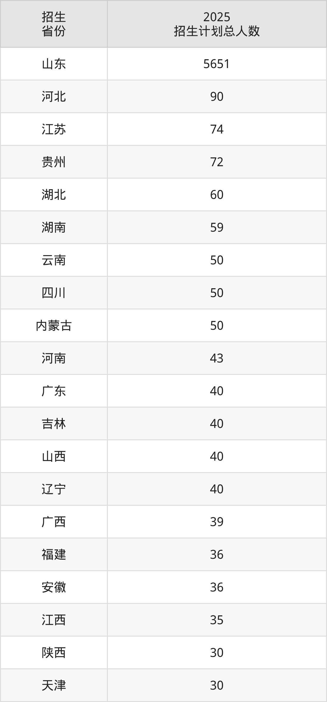 2025年临沂大学面向全国24个省市开展本科招生;招生专业共80个,招生人数共6645人。2025年在山东省招生计划总人数是5651人,其中,临沂大学在山东省招生人数最多的是物流管理。临沂大学在各省具体招生人数情况如下表。