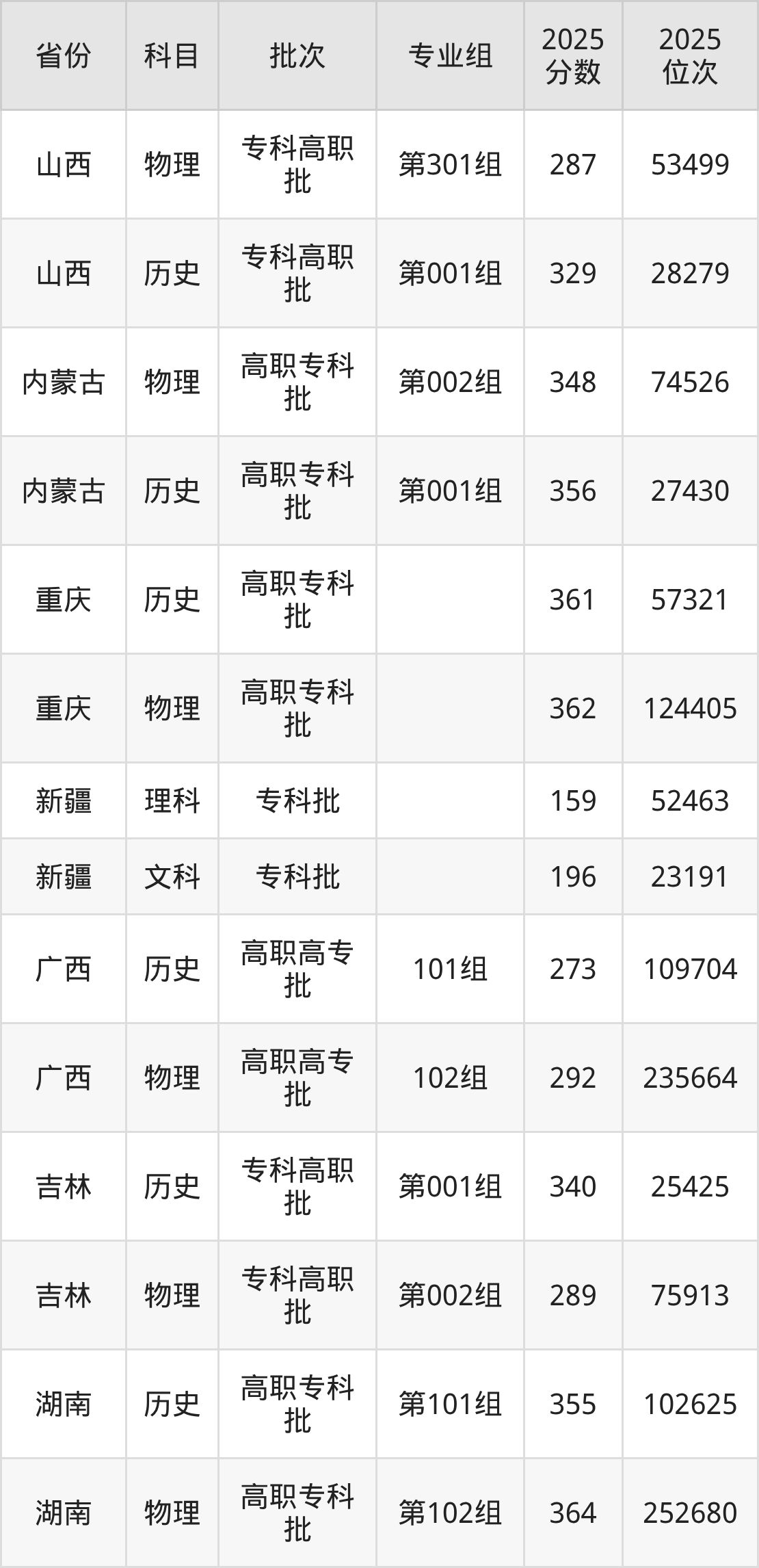 普通类专科物理类最低258分,专科历史类最低301分