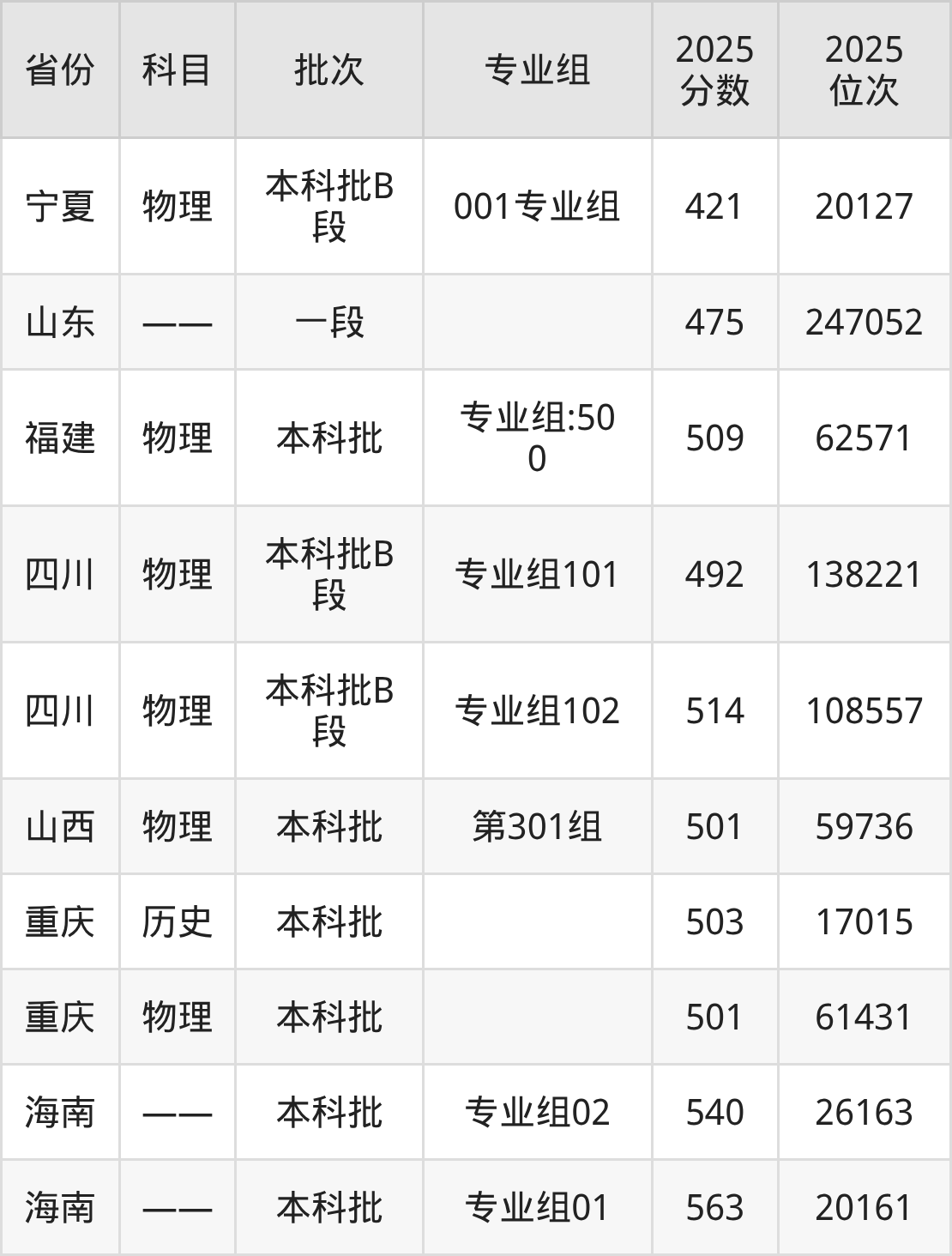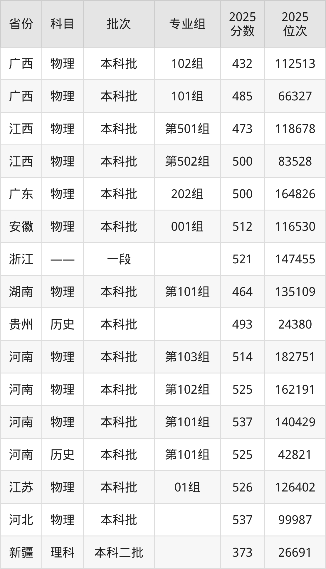 2025年在本科物理类进行招生,各专业组分数线详情如下: