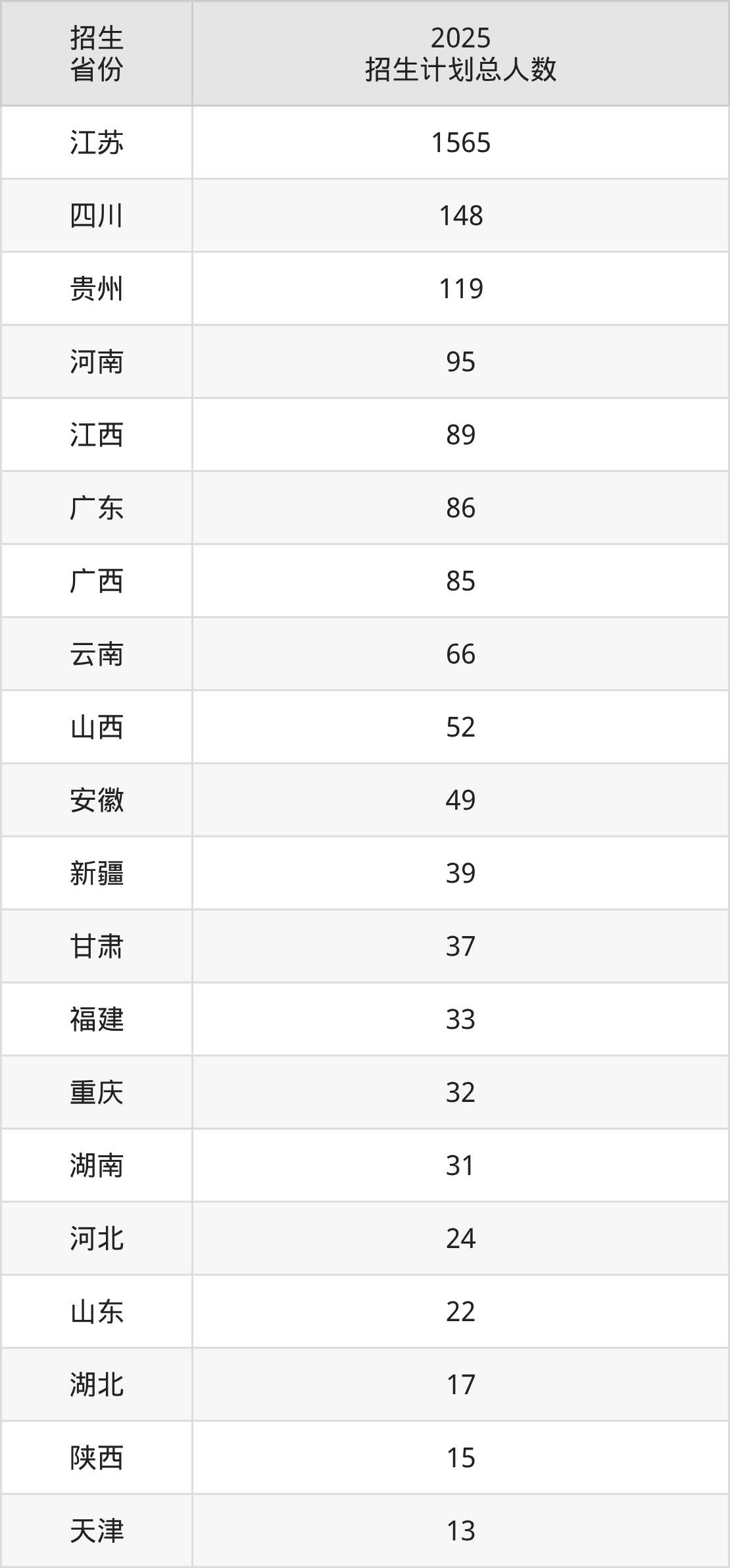 2025年南京邮电大学通达学院面向全国28个省市开展本科招生;招生专业共18个,招生人数共2689人。2025年在江苏省招生计划总人数是1565人,其中,南京邮电大学通达学院在江苏省招生人数最多的是电气工程及其自动化。南京邮电大学通达学院在各省具体招生人数情况如下表。