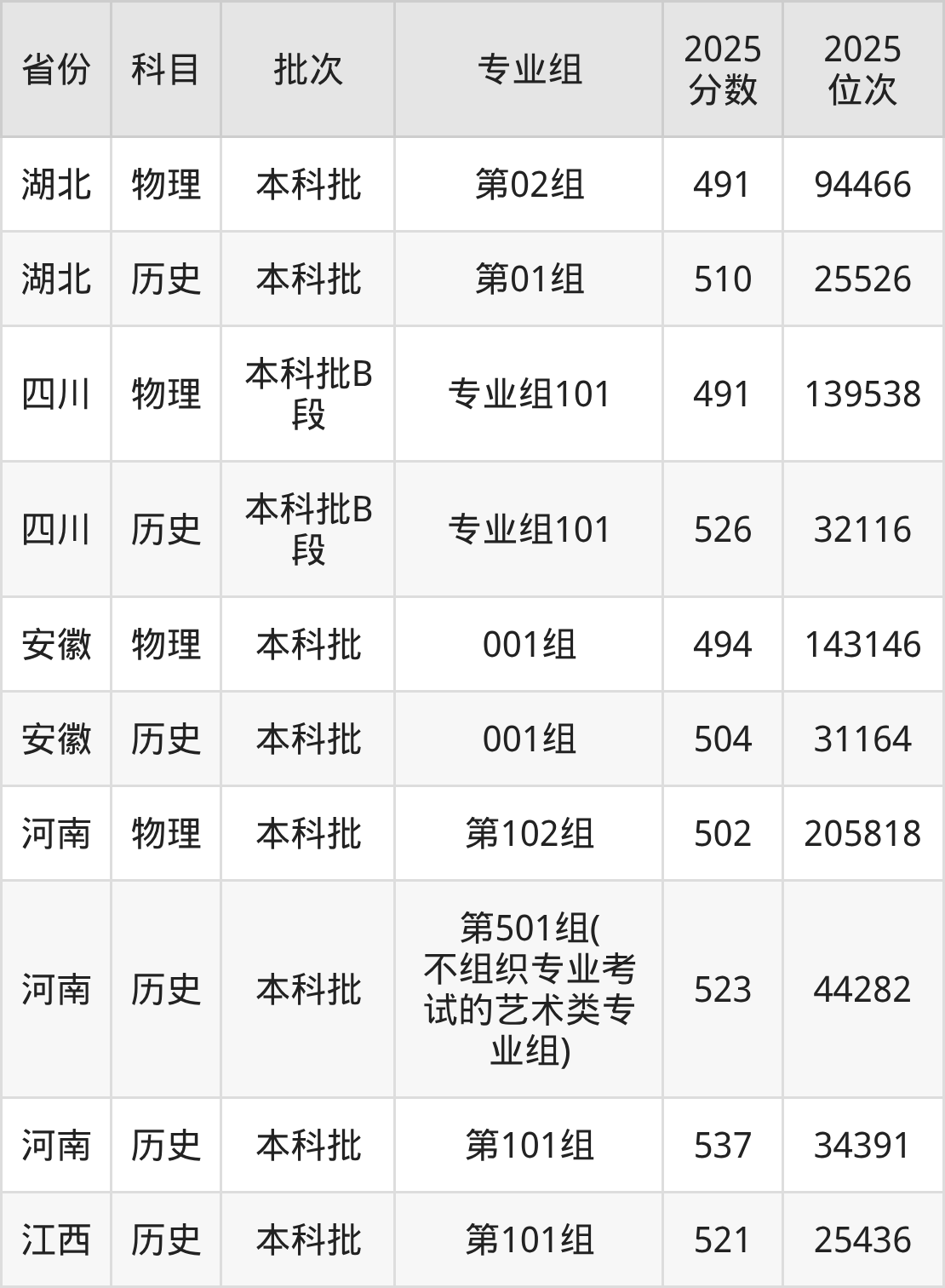 2025年在本科历史类进行招生,各专业组分数线详情如下: