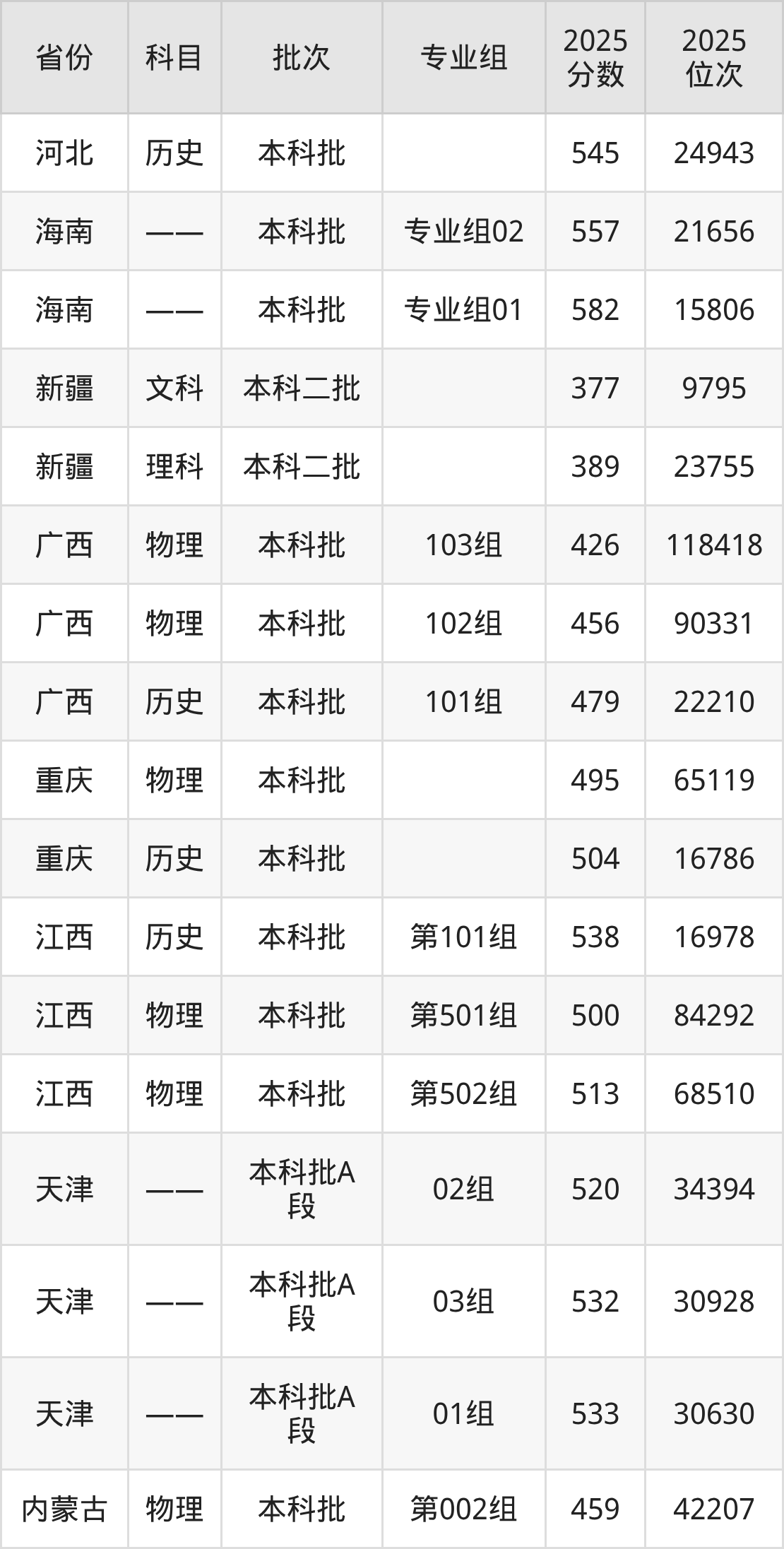 2025年河南财政金融学院全国录取分数线是377分到582分,录取最低在新疆文科、录取最高在海南(专业组01)。各省各专业组最低分具有差异,详情如下: