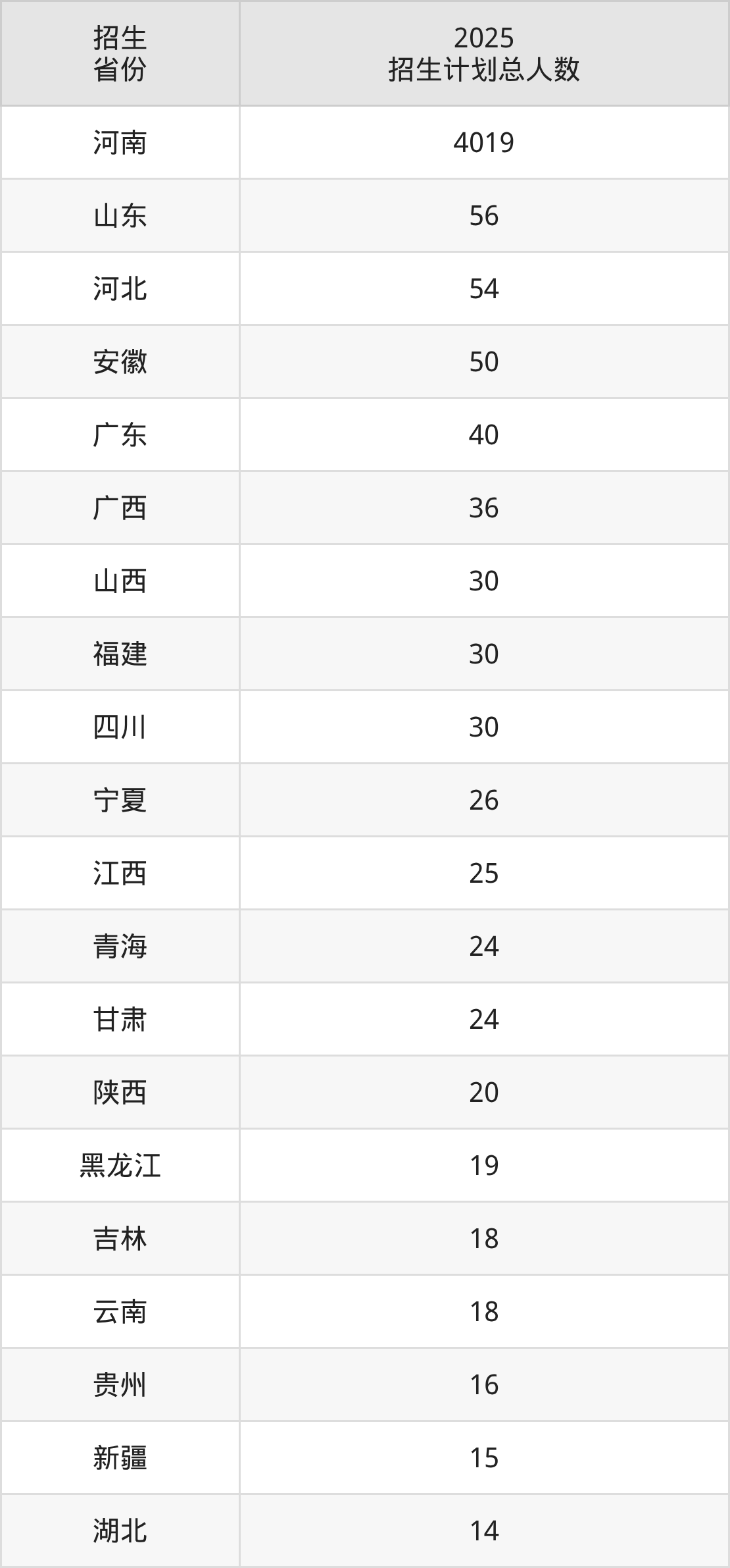 2025年河南财政金融学院面向全国27个省市开展本科招生;招生专业共38个,招生人数共4634人。2025年在河南省招生计划总人数是4019人,其中,河南财政金融学院在河南省招生人数最多的是数学与应用数学。河南财政金融学院在各省具体招生人数情况如下表。