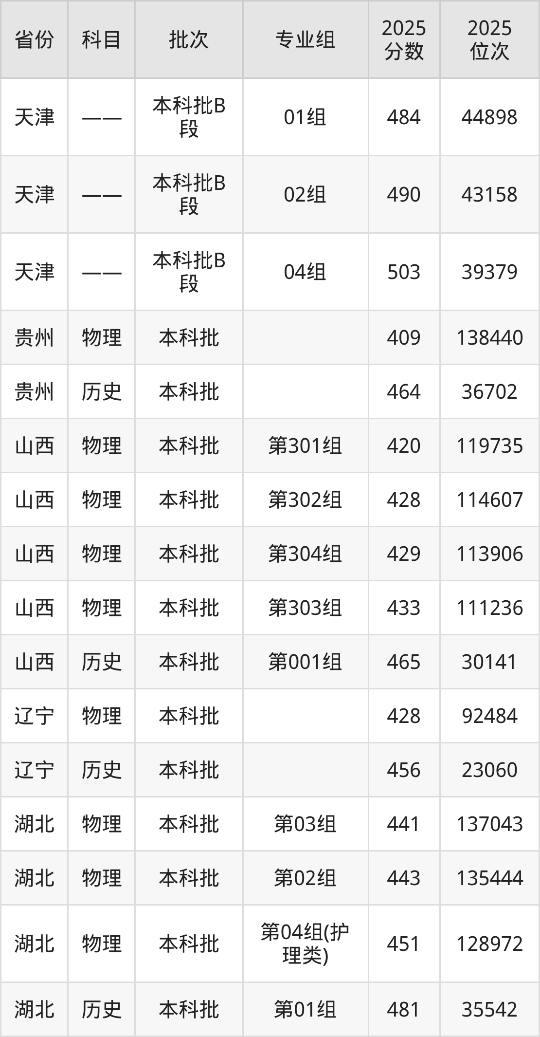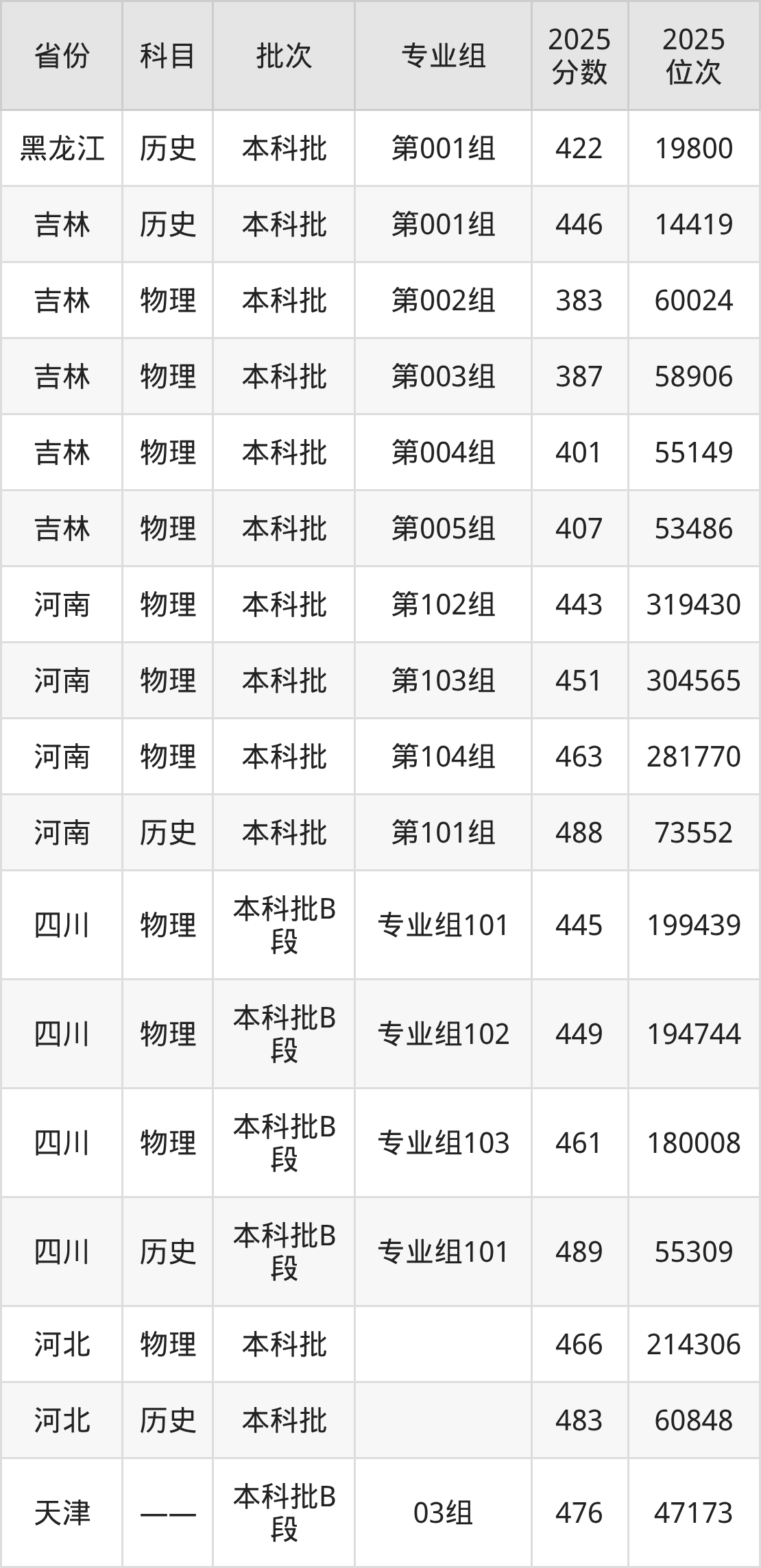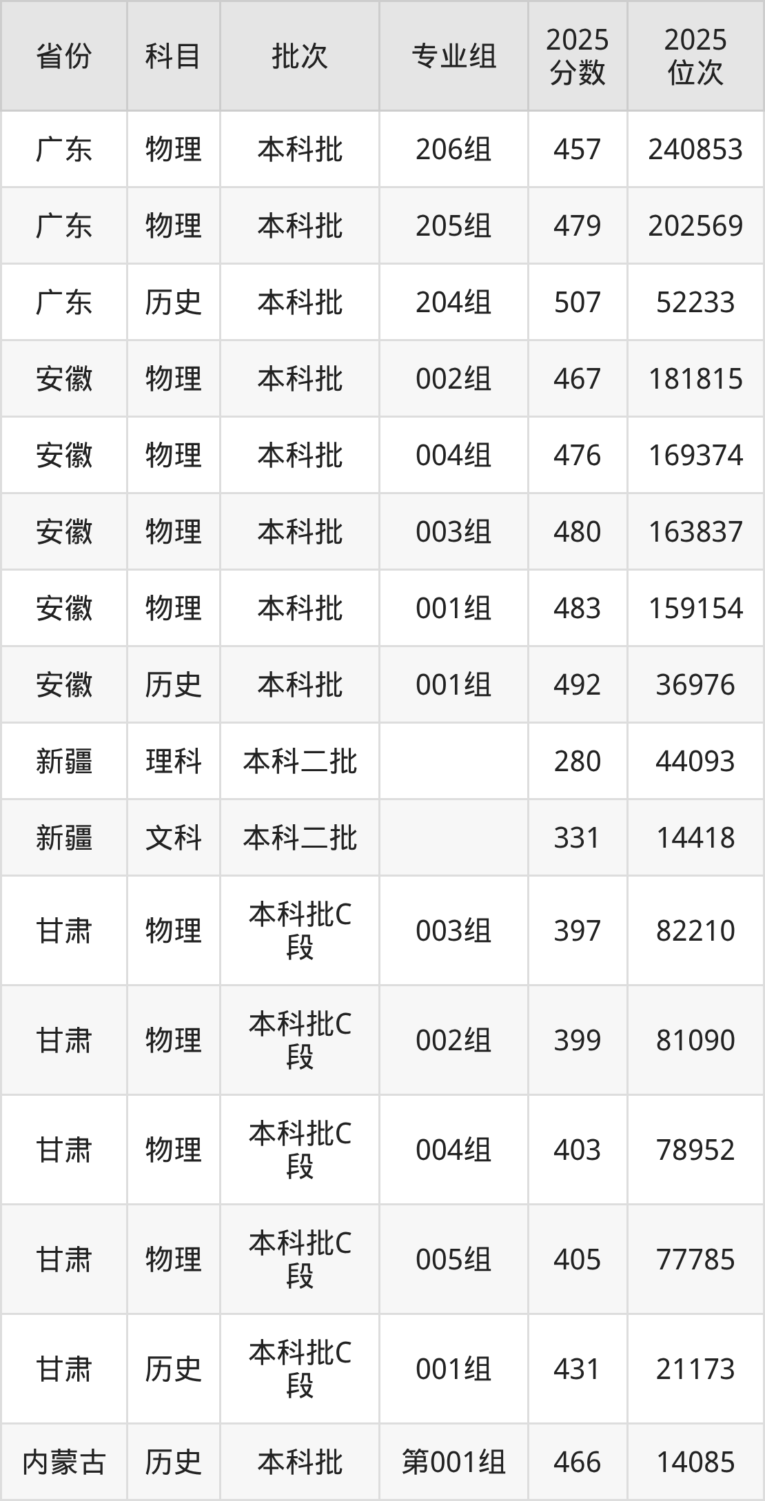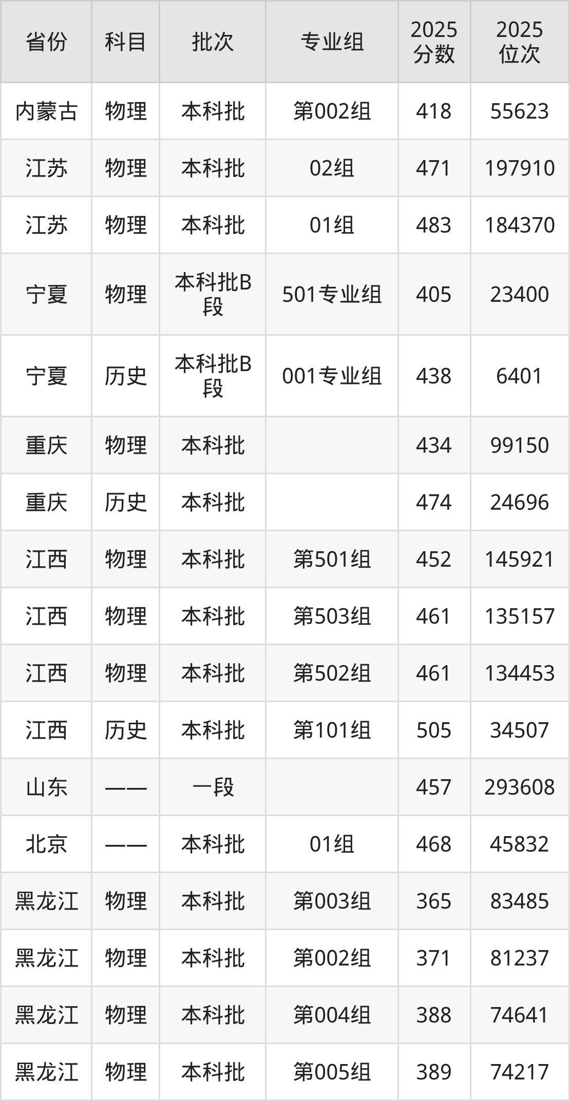 2025年在本科物理类进行招生,各专业组分数线详情如下: