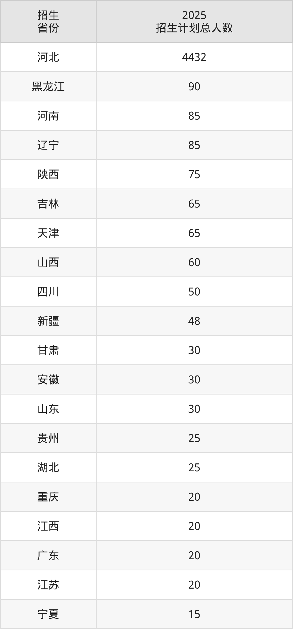 2025年河北地质大学华信学院面向全国22个省市开展本科招生;招生专业共18个,招生人数共5303人。2025年在河北省招生计划总人数是4432人,其中,河北地质大学华信学院在河北省招生人数最多的是计算机类。河北地质大学华信学院在各省具体招生人数情况如下表。