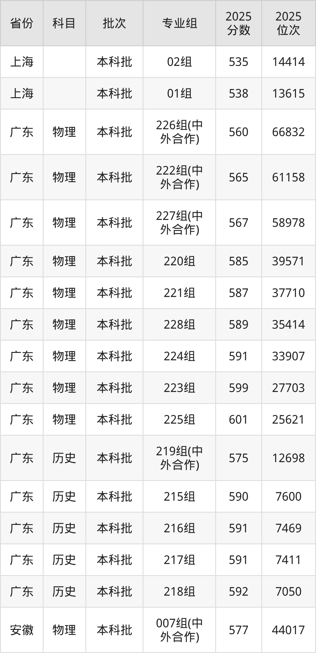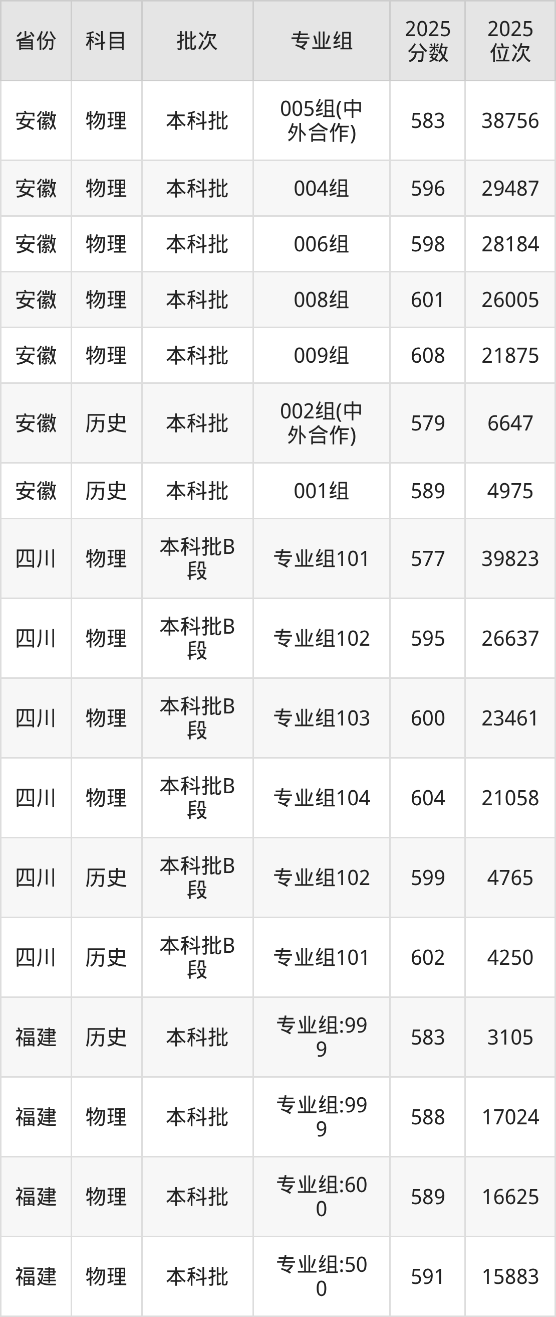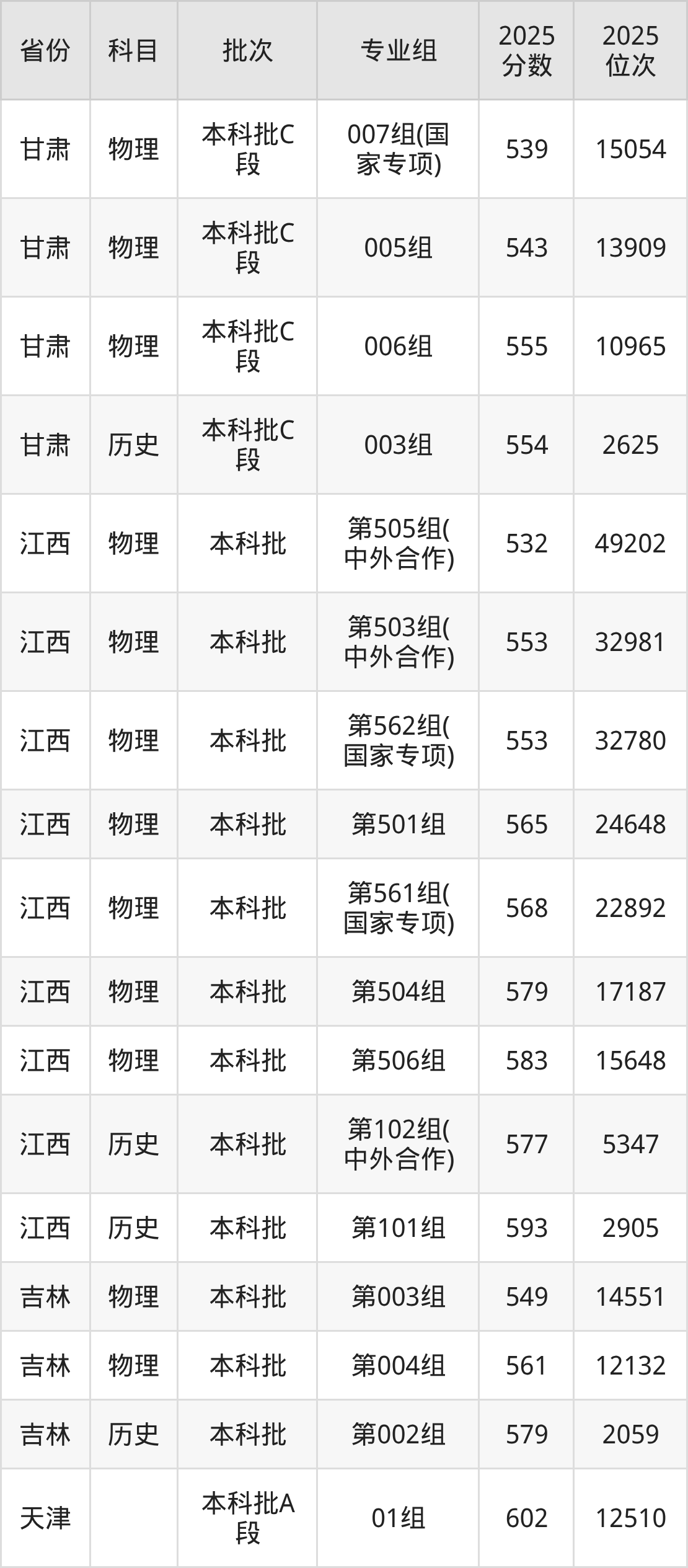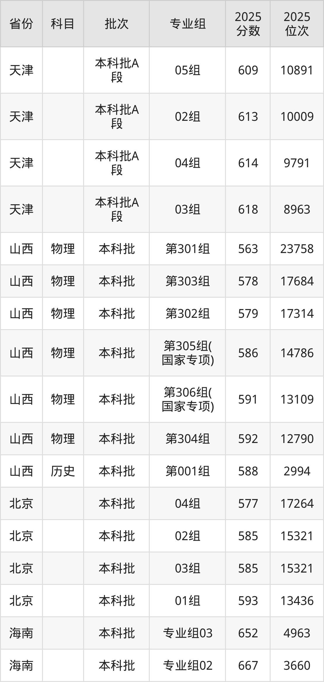 2025年在本科理科进行招生,各专业组分数线详情如下: