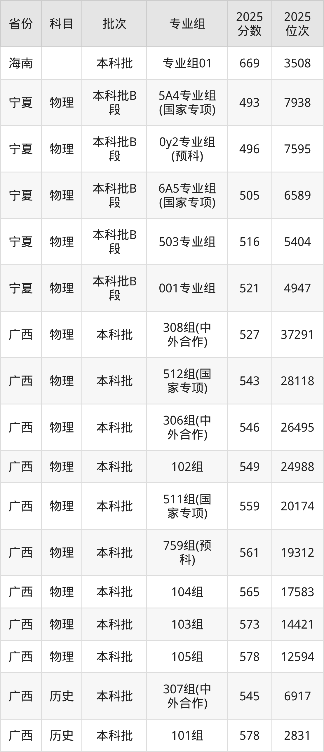 2025年华中农业大学全国录取分数线是493分到669分,录取最低在宁夏物理类(5A4专业组(国家专项))、录取最高在海南(专业组01)。各省各专业组最低分具有差异,详情如下: