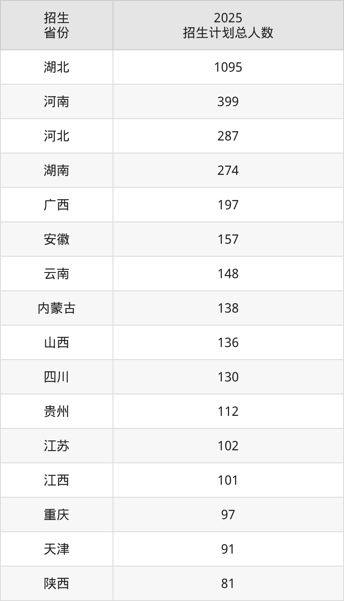 2025年华中农业大学面向全国28个省市开展本科招生;招生专业共40个,招生人数共3990人。2025年在湖北省招生计划总人数是1095人,其中,华中农业大学在湖北省招生人数最多的是机械类。华中农业大学在各省具体招生人数情况如下表。