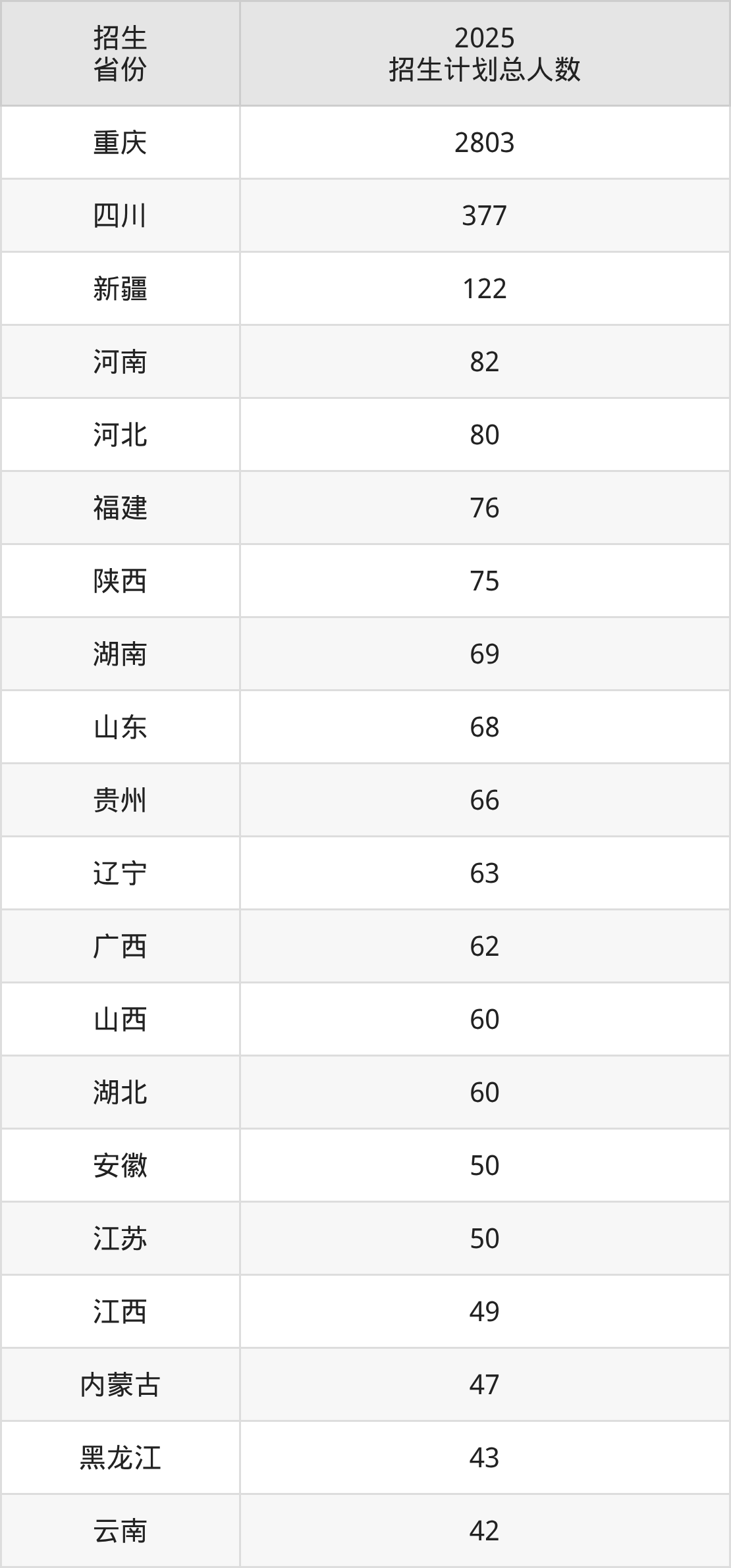 2025年重庆科技大学面向全国29个省市开展本科招生;招生专业共55个,招生人数共4529人。2025年在重庆市招生计划总人数是2803人,其中,重庆科技大学在重庆市招生人数最多的是安全工程。重庆科技大学在各省具体招生人数情况如下表。