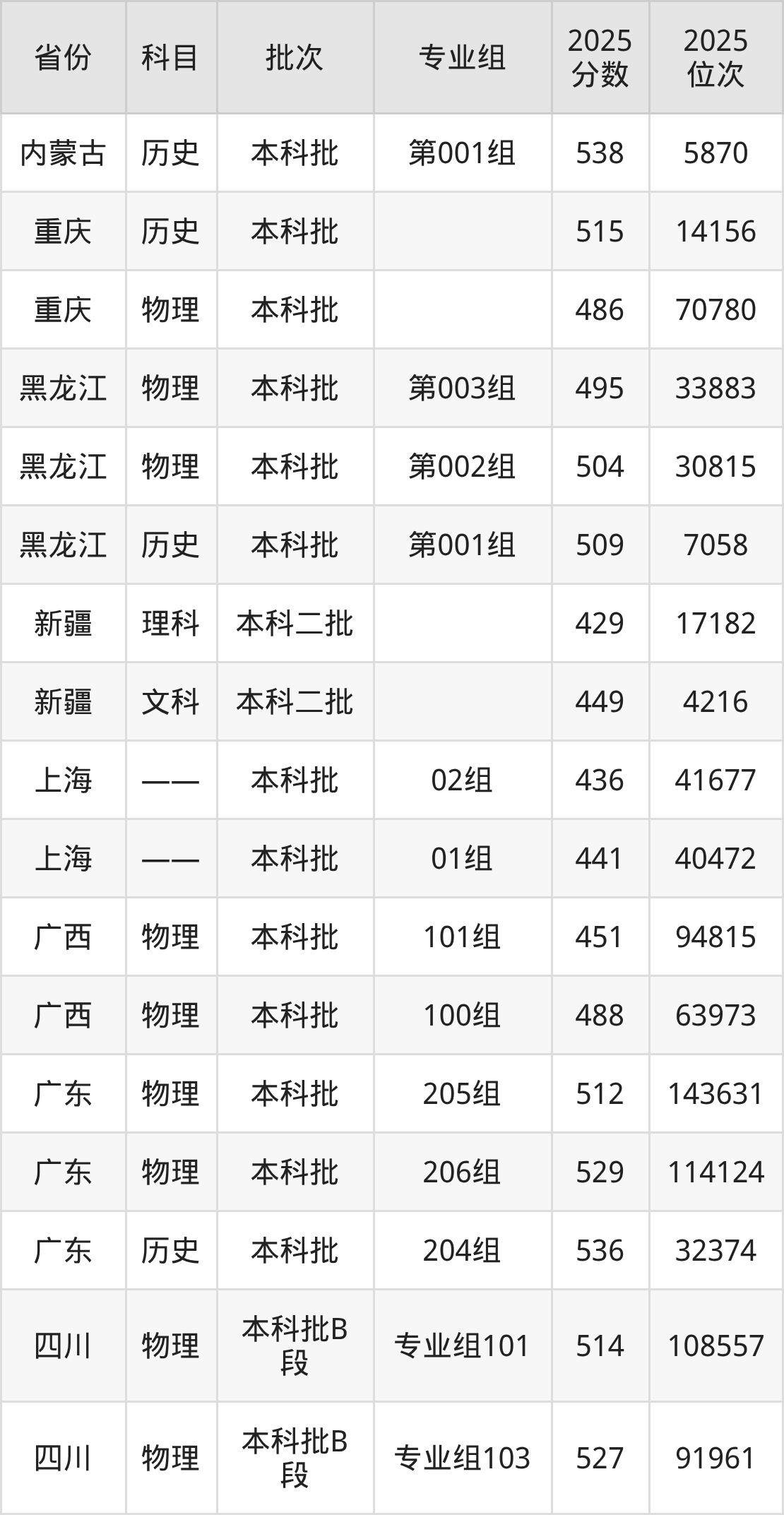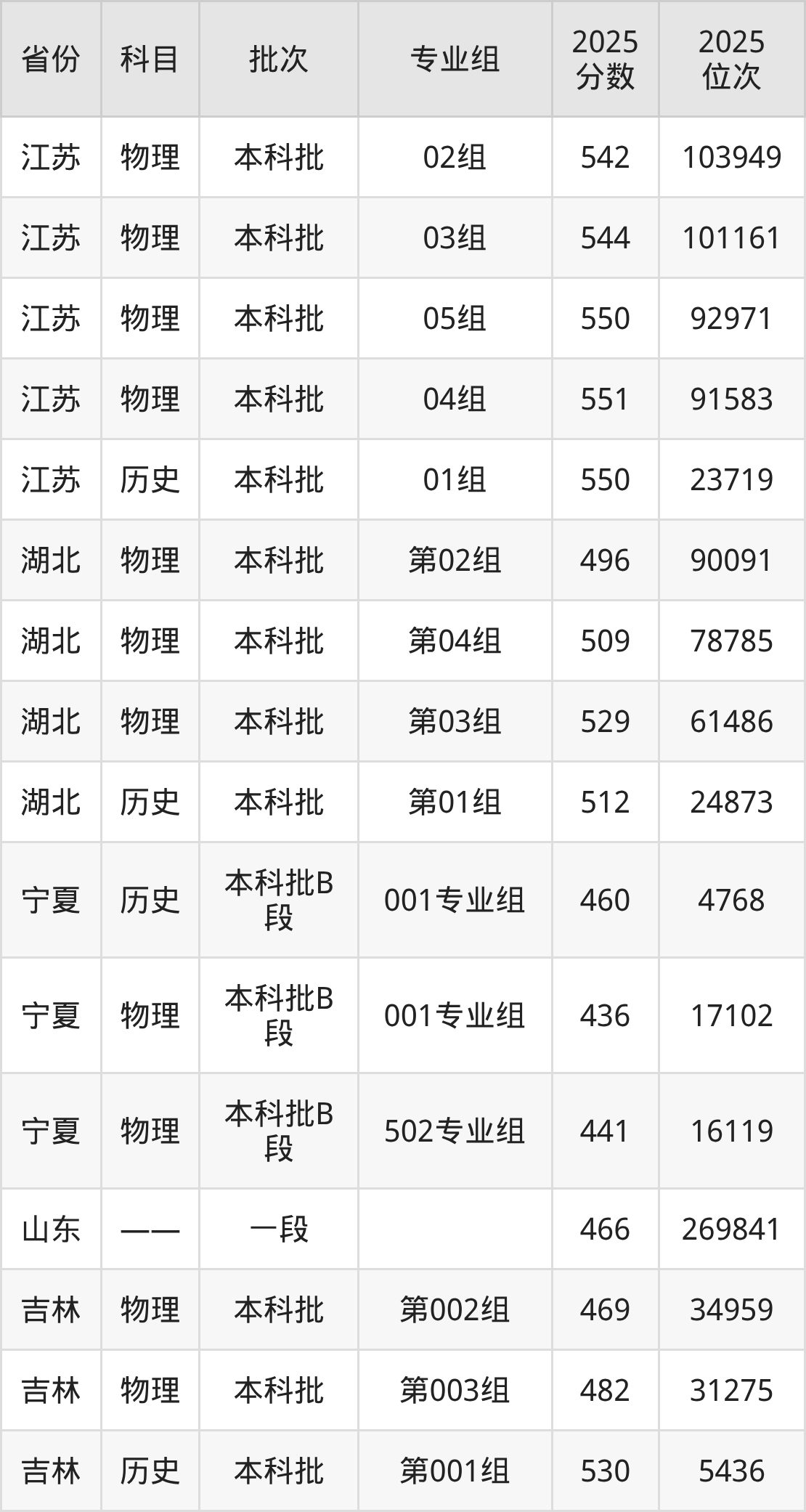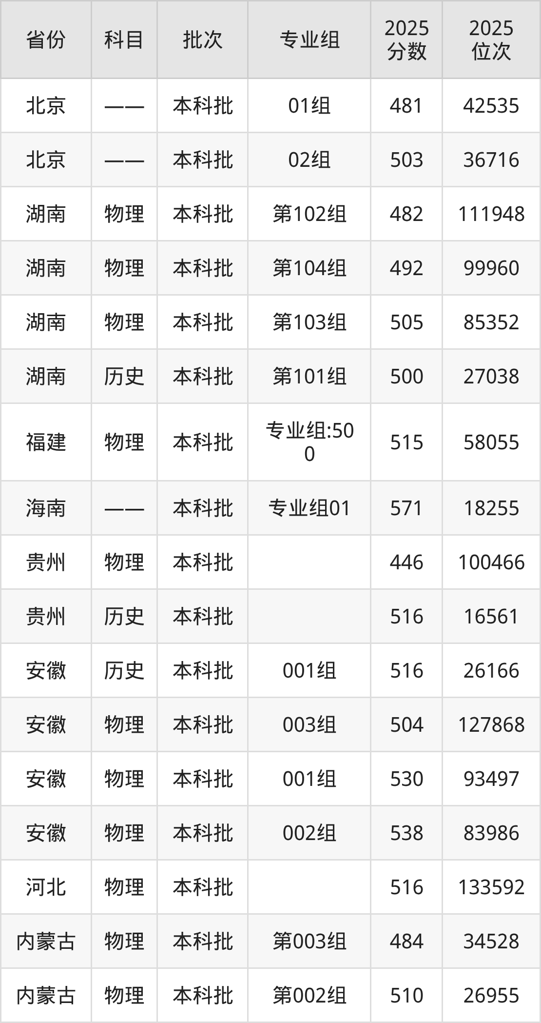 2025年在本科物理类进行招生,各专业组分数线详情如下: