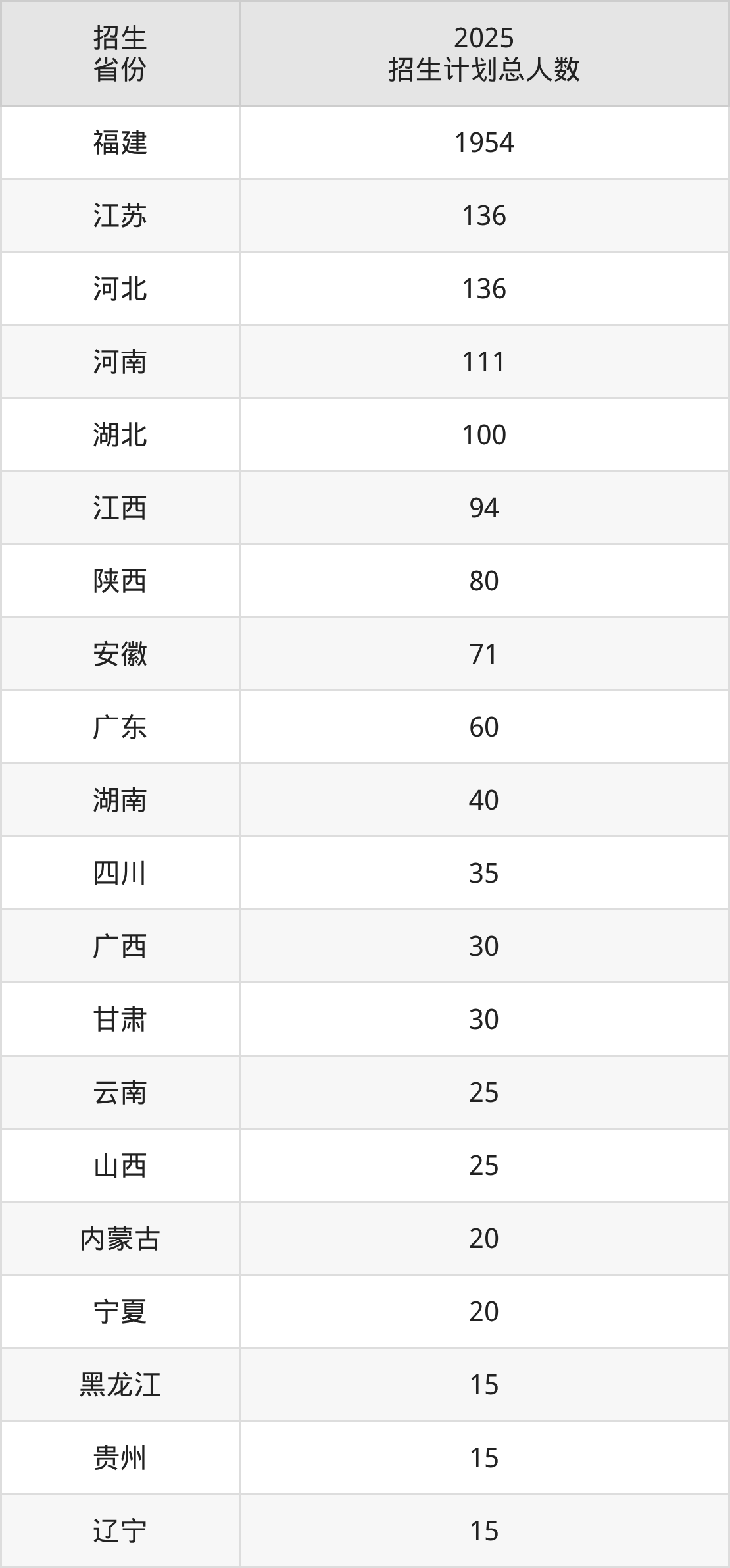 2025年福州大学至诚学院面向全国22个省市开展本科招生;招生专业共25个,招生人数共3034人。2025年在福建省招生计划总人数是1954人,其中,福州大学至诚学院在福建省招生人数最多的是电子信息工程。福州大学至诚学院在各省具体招生人数情况如下表。