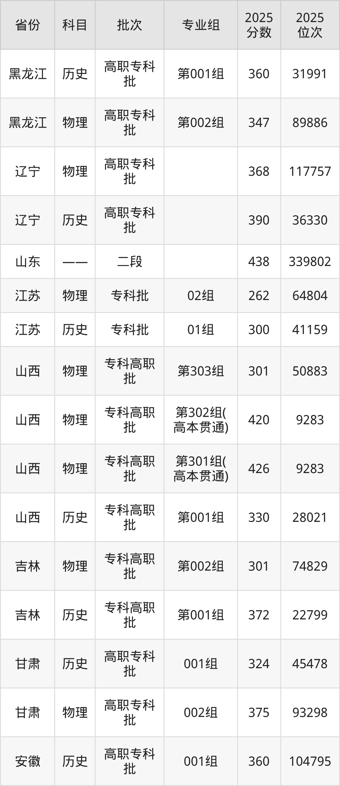 山西职业技术学院001组:2025年投档录取最低分为360分,录取最低位次为104795名。
