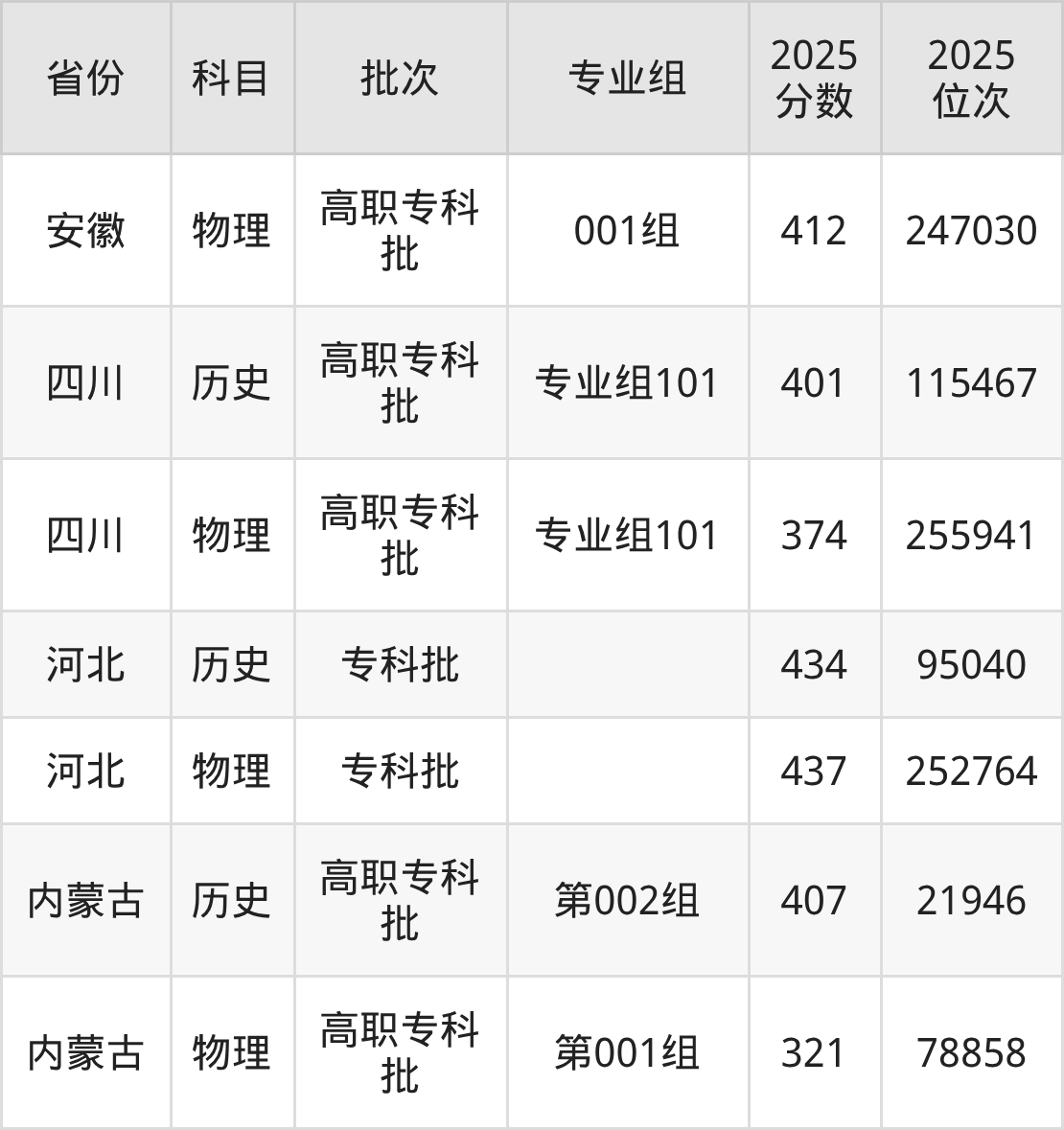 山西职业技术学院001组:2025年投档录取最低分为412分,录取最低位次为247030名。