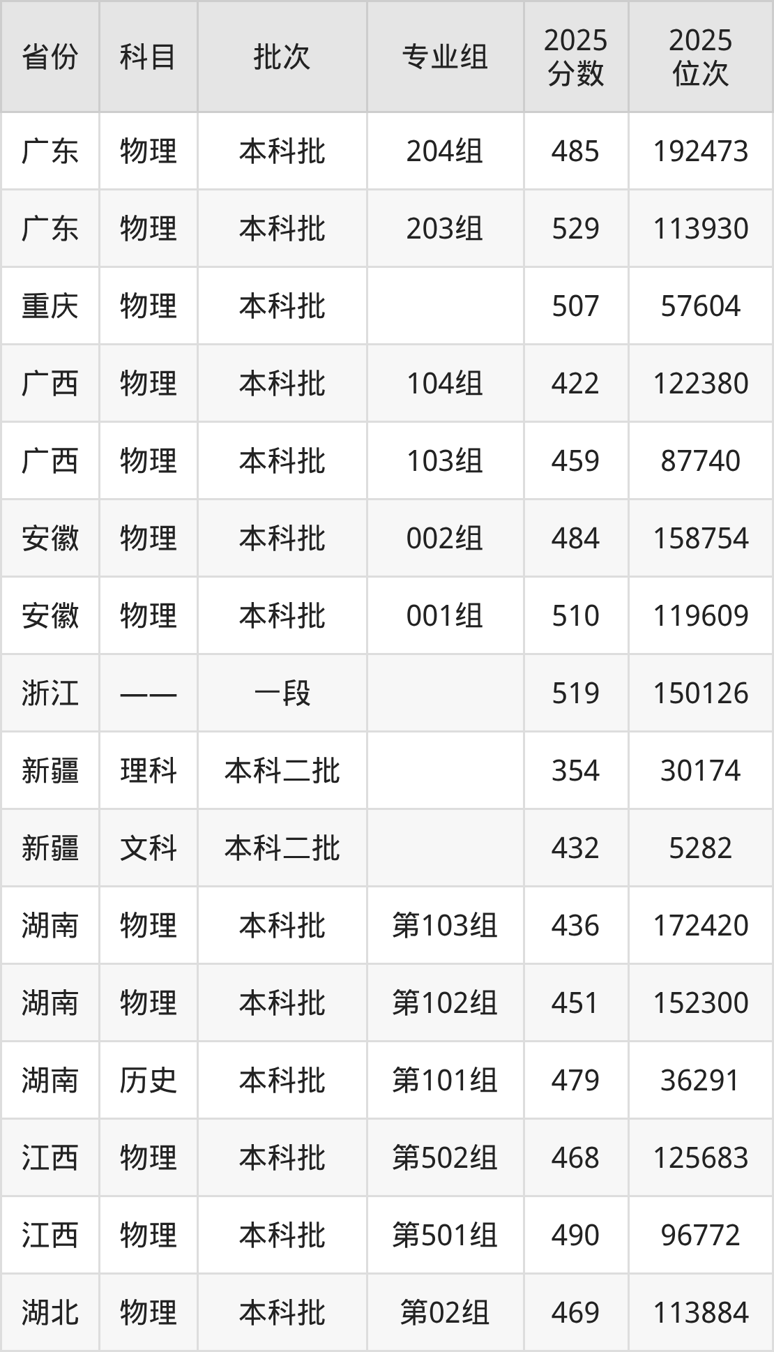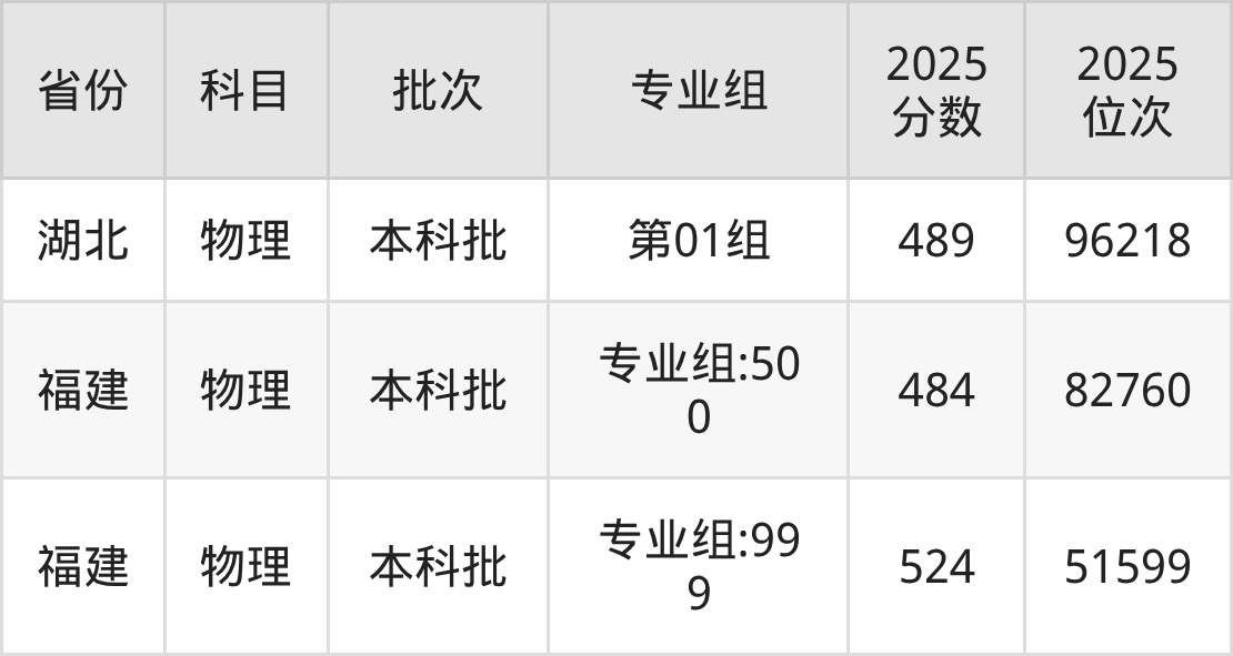 2025年在本科物理类进行招生,各专业组分数线详情如下: