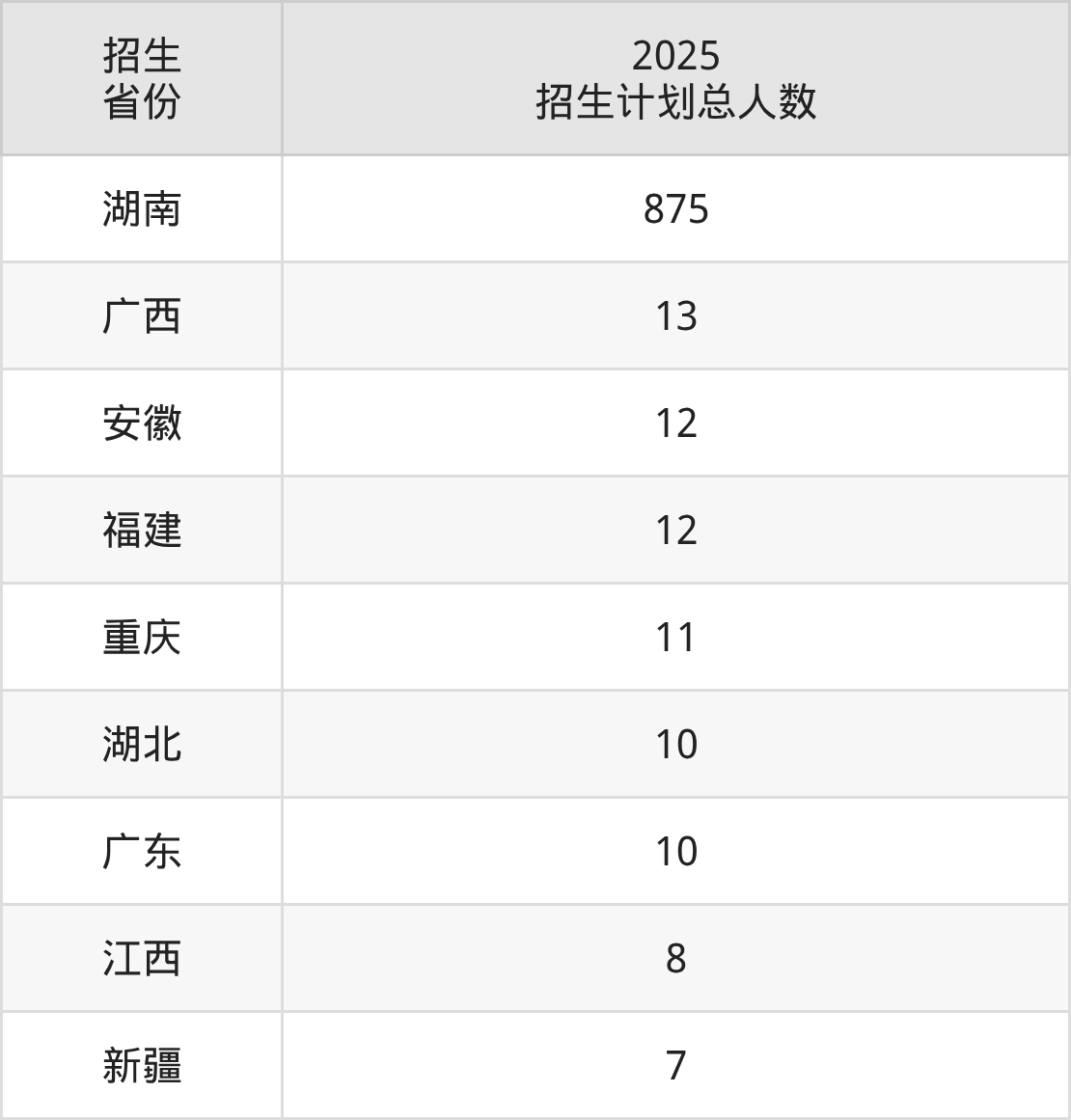 2025年湖南中医药大学湘杏学院面向全国9个省市开展本科招生;招生专业共13个,招生人数共958人。2025年在湖南省招生计划总人数是875人,其中,湖南中医药大学湘杏学院在湖南省招生人数最多的是护理学。湖南中医药大学湘杏学院在各省具体招生人数情况如下表。