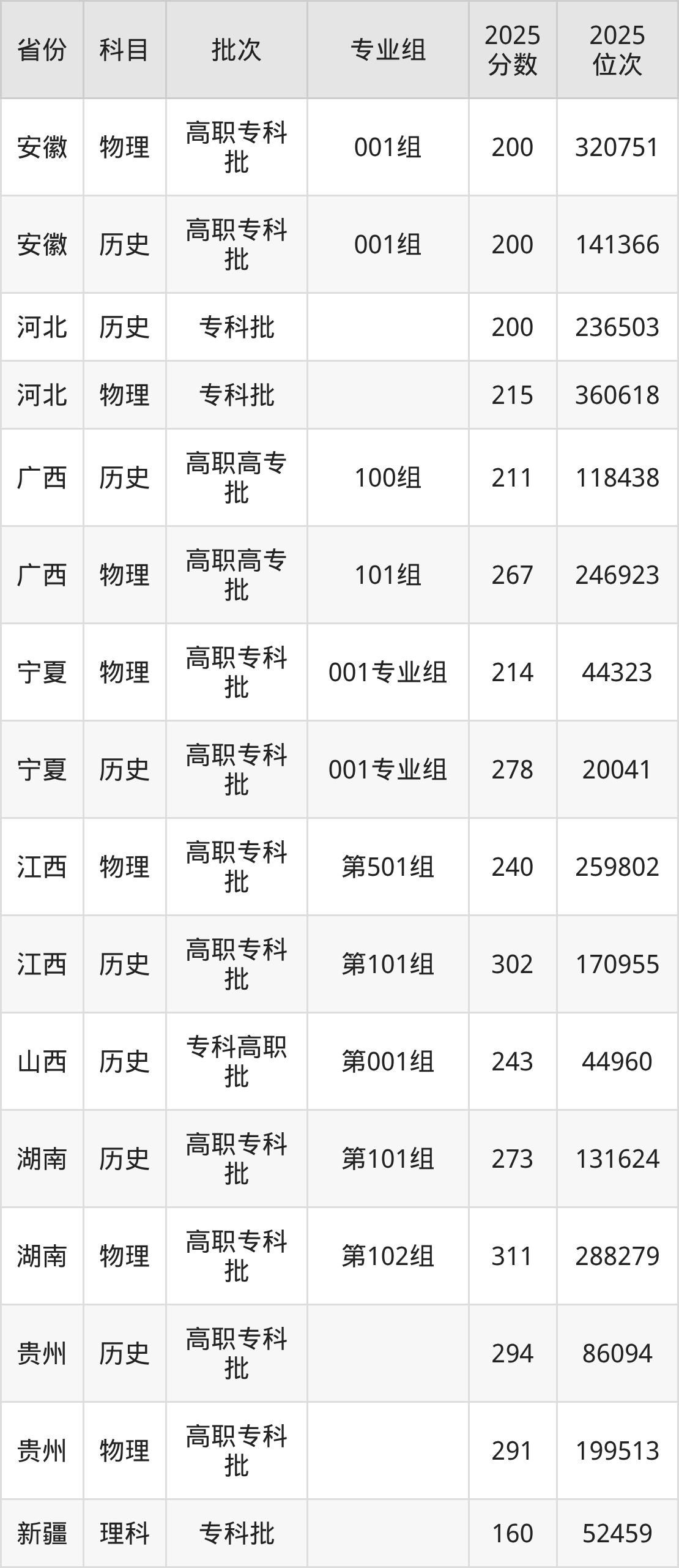 2025年在专科历史类进行招生,各专业组分数线详情如下: