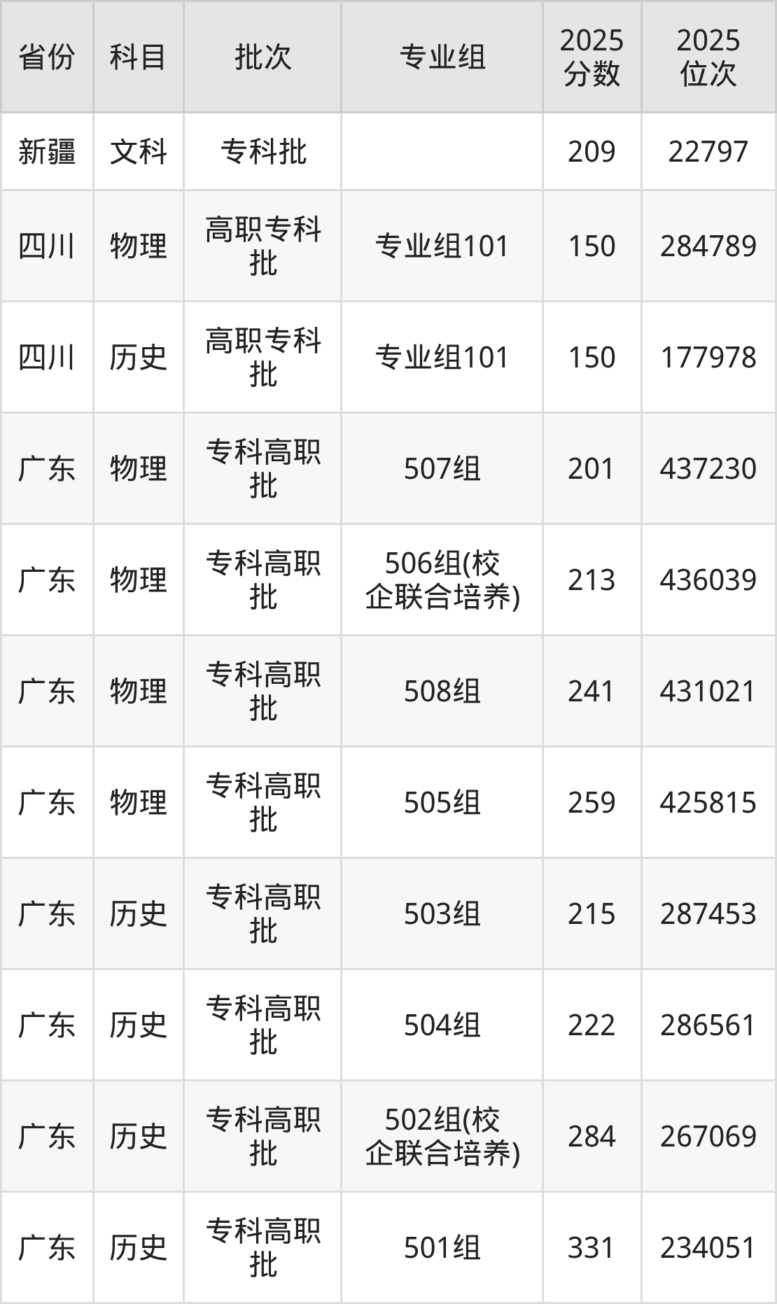 2025年广东南方职业学院全国录取分数线是150分到331分,录取最低在四川物理类(专业组101)、录取最高在广东历史类(501组)。各省各专业组最低分具有差异,详情如下: