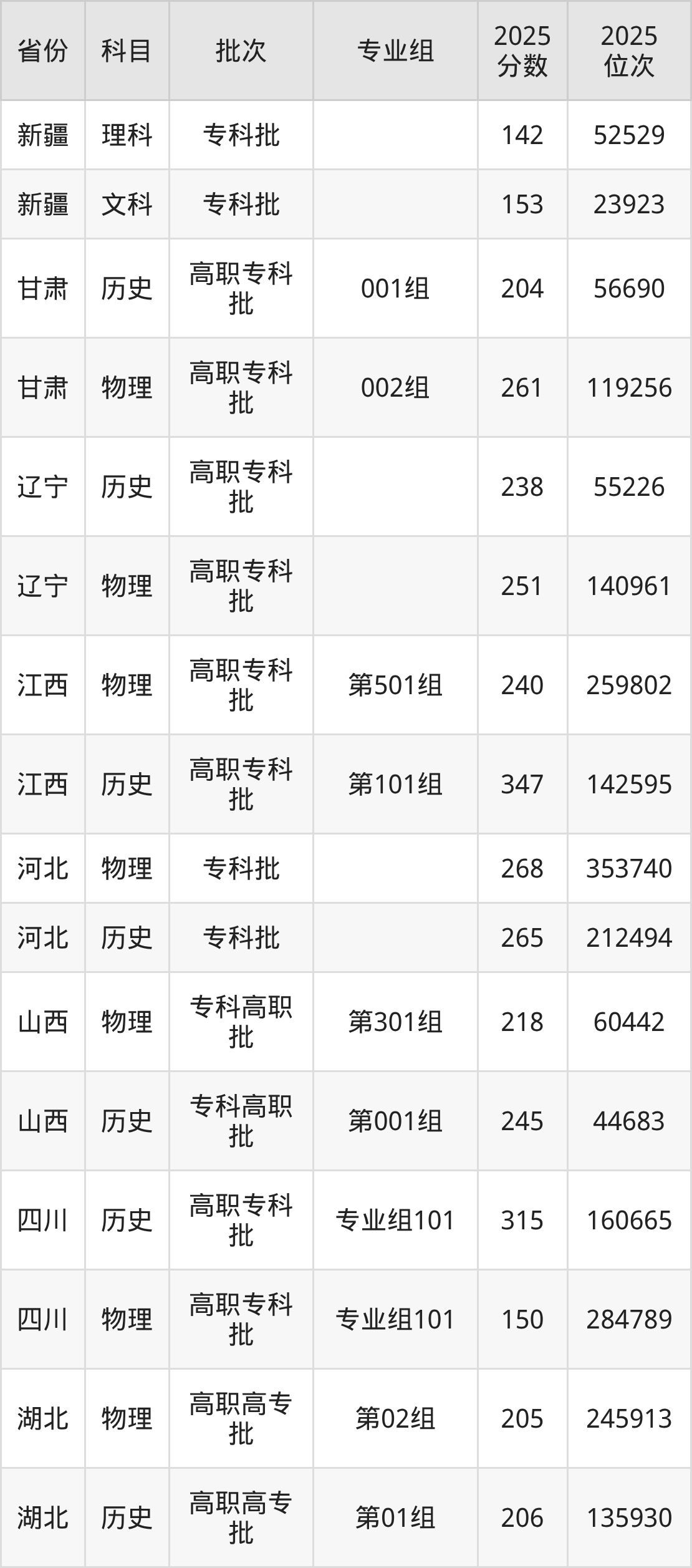 普通类专科物理类最低261分,专科历史类最低204分