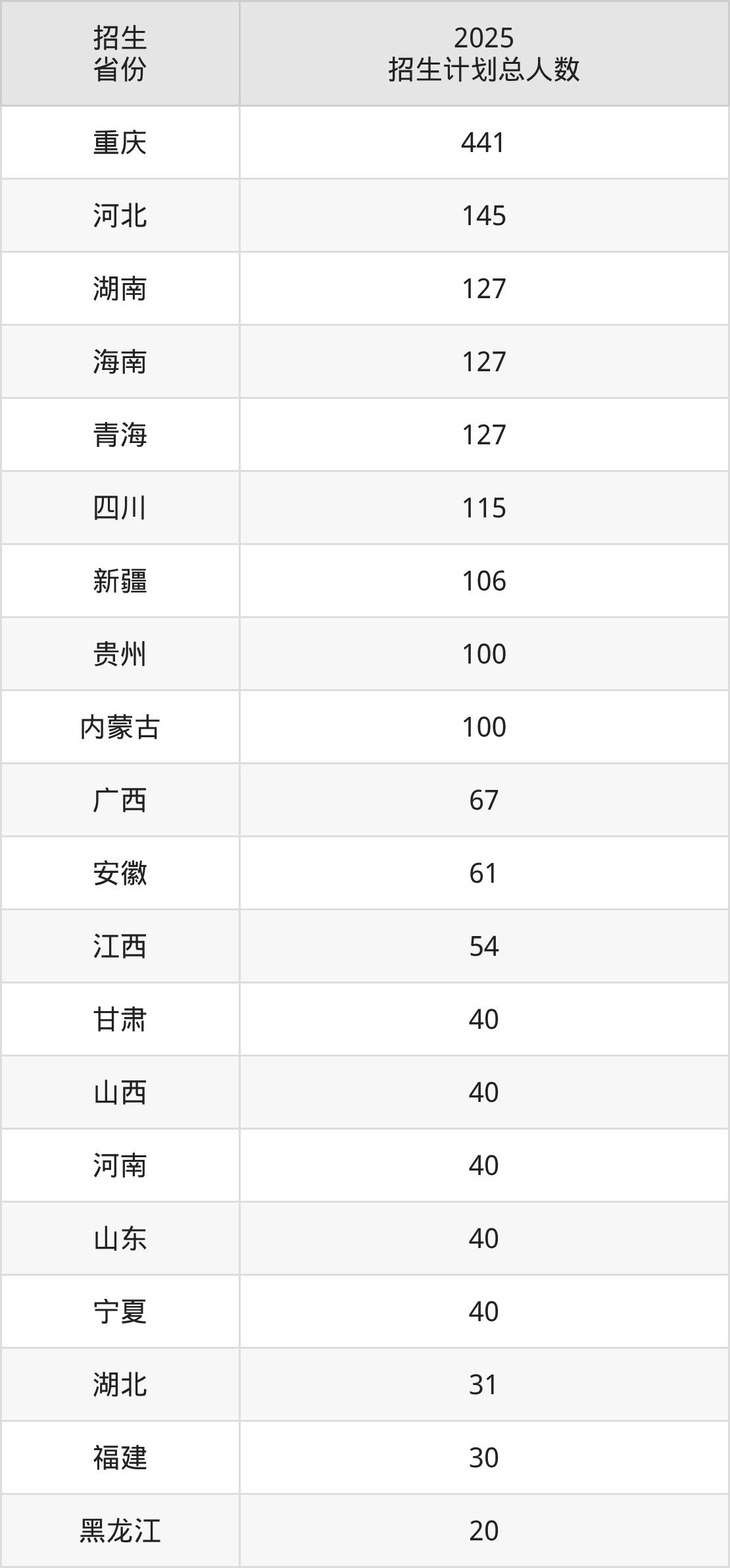 2025年重庆信息技术职业学院面向全国22个省市开展专科招生;招生专业共18个,招生人数共1886人。2025年在重庆市招生计划总人数是441人,其中,重庆信息技术职业学院在重庆市招生人数最多的是康复治疗技术。重庆信息技术职业学院在各省具体招生人数情况如下表。