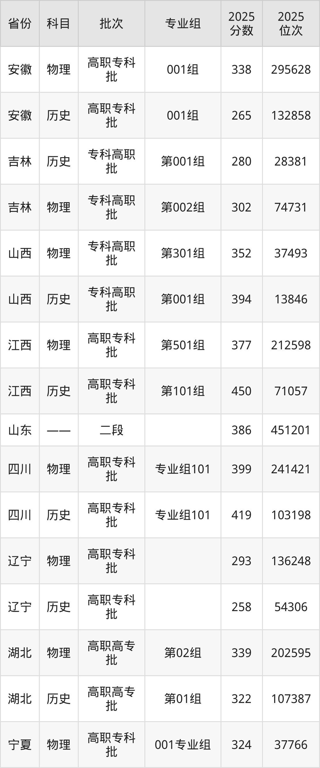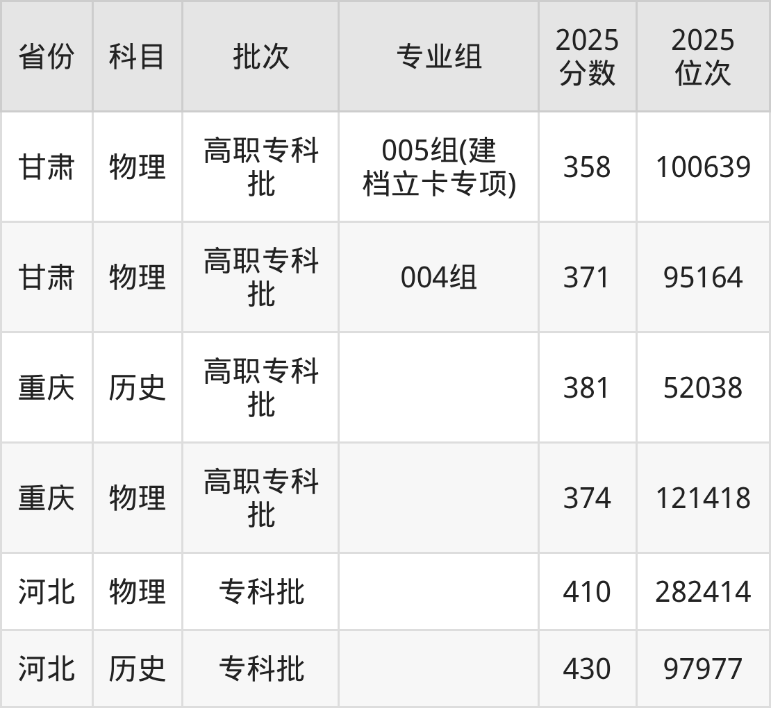 甘肃交通职业技术学院002专业组:2025年投档录取最低分为379分,录取最低位次为32668名。