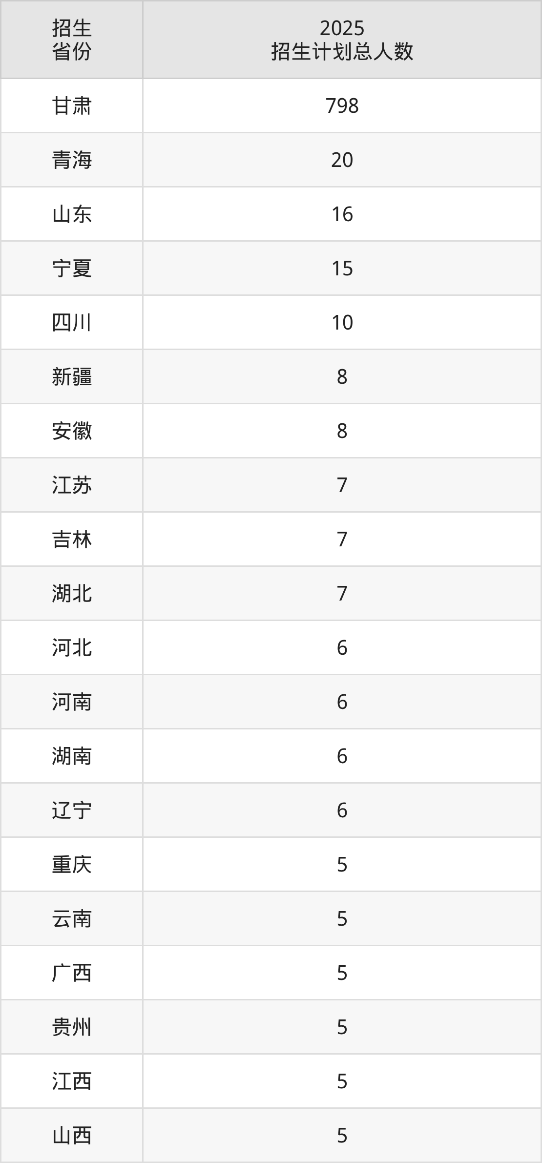 2025年甘肃交通职业技术学院面向全国24个省市开展专科招生;招生专业共34个,招生人数共964人。2025年在甘肃省招生计划总人数是798人,其中,甘肃交通职业技术学院在甘肃省招生人数最多的是邮政快递运营管理。甘肃交通职业技术学院在各省具体招生人数情况如下表。