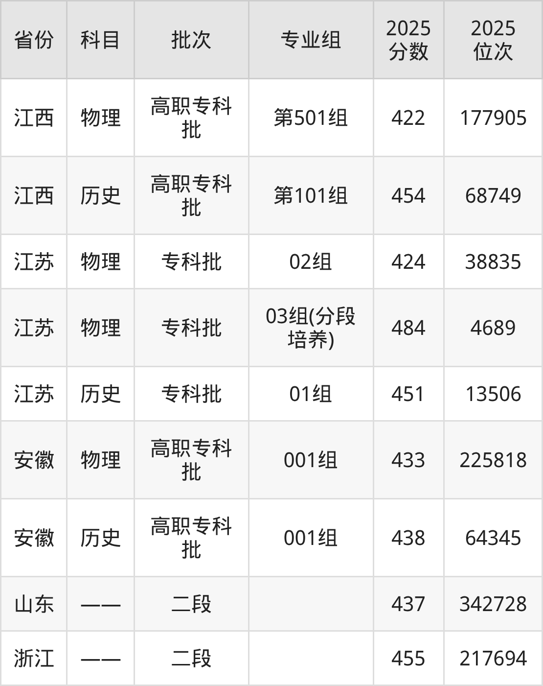 苏州信息职业技术学院001组:2025年投档录取最低分为433分,录取最低位次为225818名。