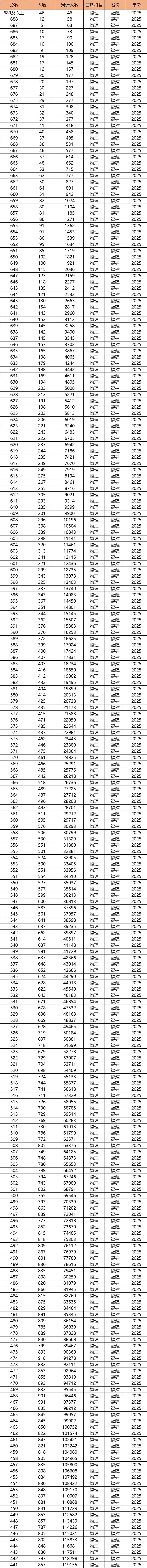 2025年福建省高考成绩首选物理类689分及以上的考生,共计46人;600分以上的考生,共计12735人;500分以上的考生,共计69546人;首选物理类考生过本科录取分数线的人数共119155人。