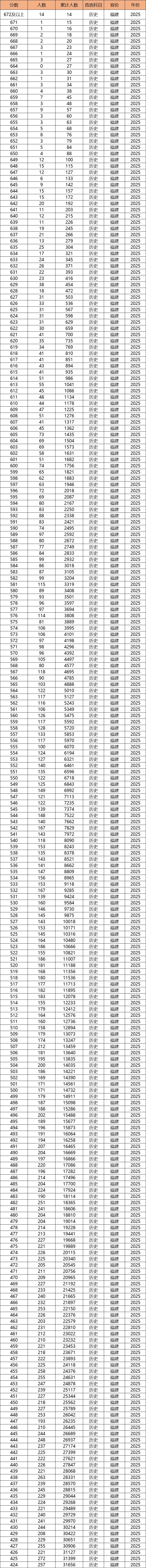 2025年福建省高考成绩首选历史类672分及以上的考生,共计14人;600分以上的考生,共计1756人;500分以上的考生,共计14732人;首选历史类考生过本科录取分数线的人数共25562人。
