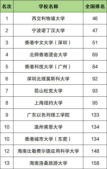 以上院校均为中国与国外合作办学的院校,除此之外,还有大陆与香港合作的院校也在校友会中国合作办学大学排名榜单中,具体的评分及星级如下:
