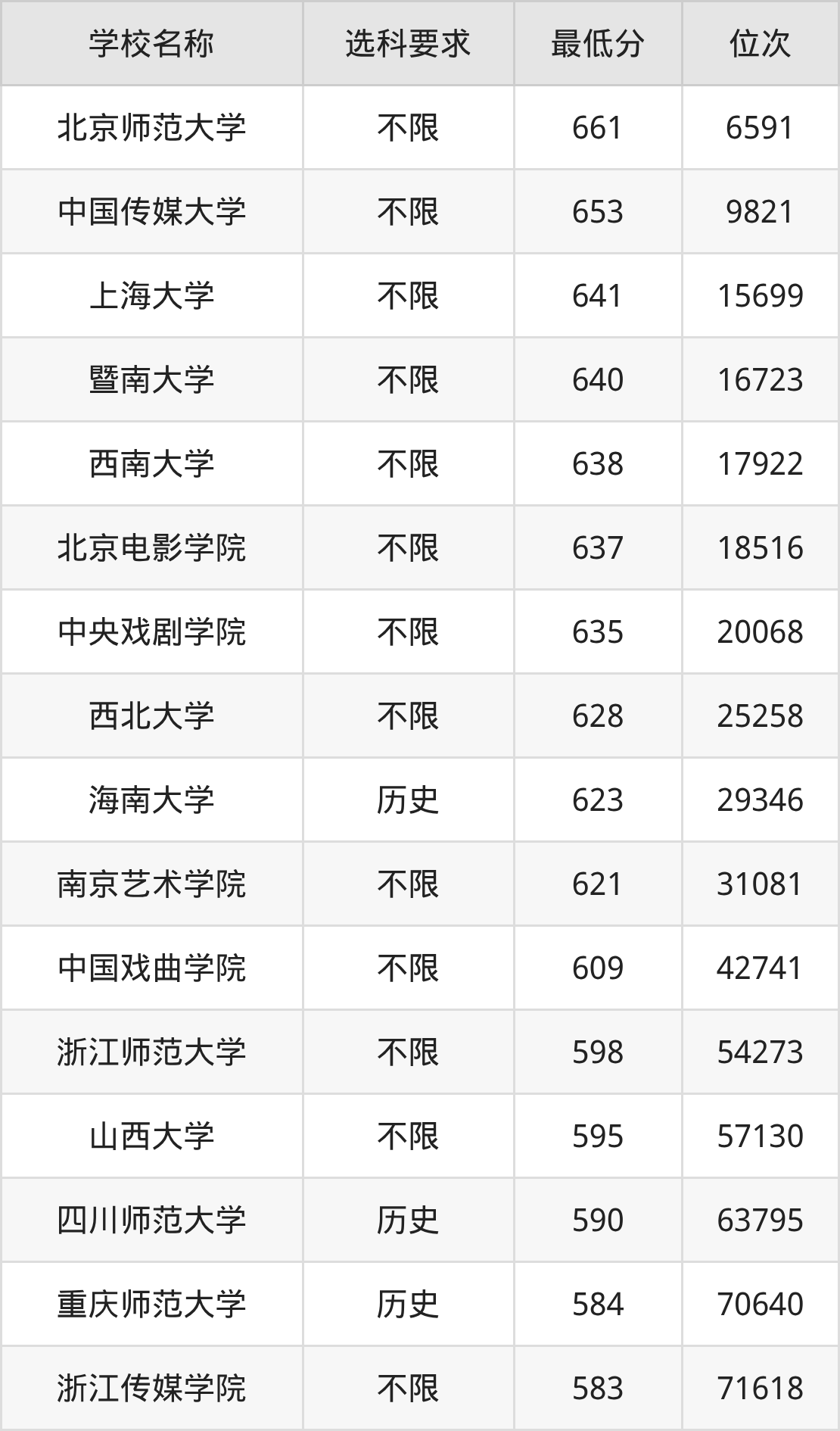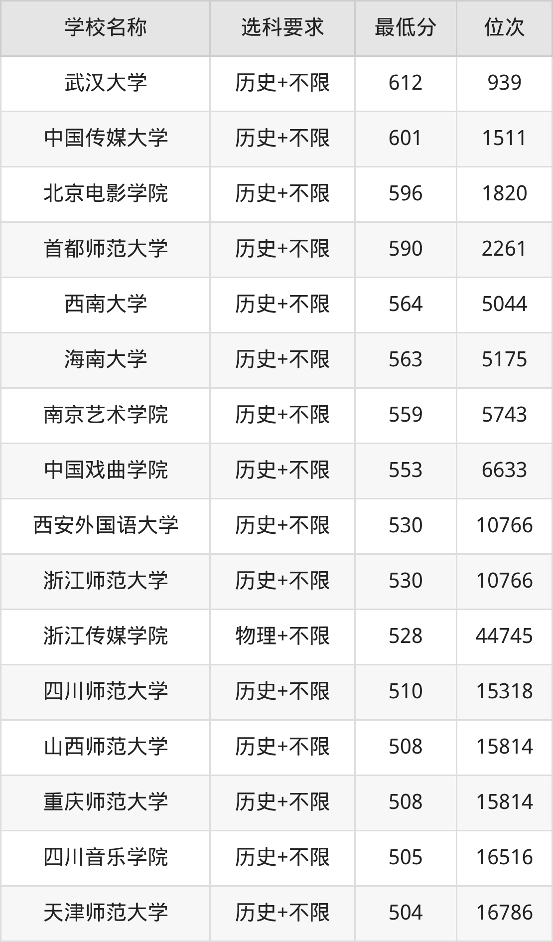 需要注意的是,戏剧影视文学专业大学中有28所不限选科要求,如北京师范大学、中国传媒大学等;有3所要求考生必选“历史”,如海南大学、四川师范大学等,因此大家在报考前要提前了解清楚专业选科要求。