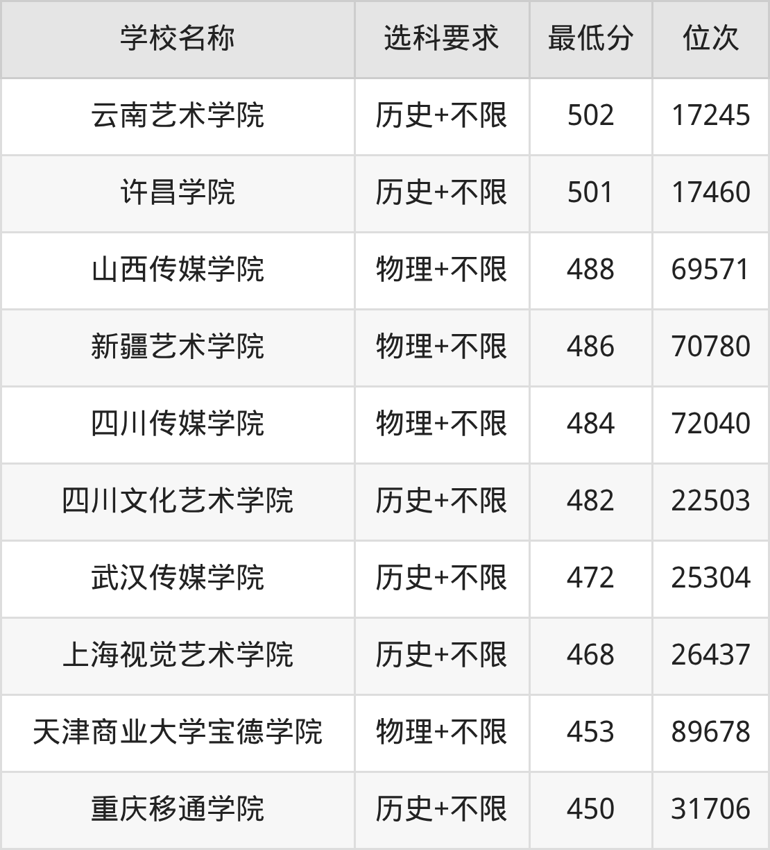 而十强院校中,中国戏曲学院排全国第6名、北京电影学院排全国第7名、云南艺术学院排全国第10名。