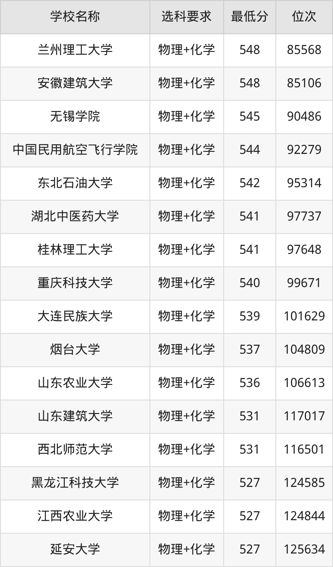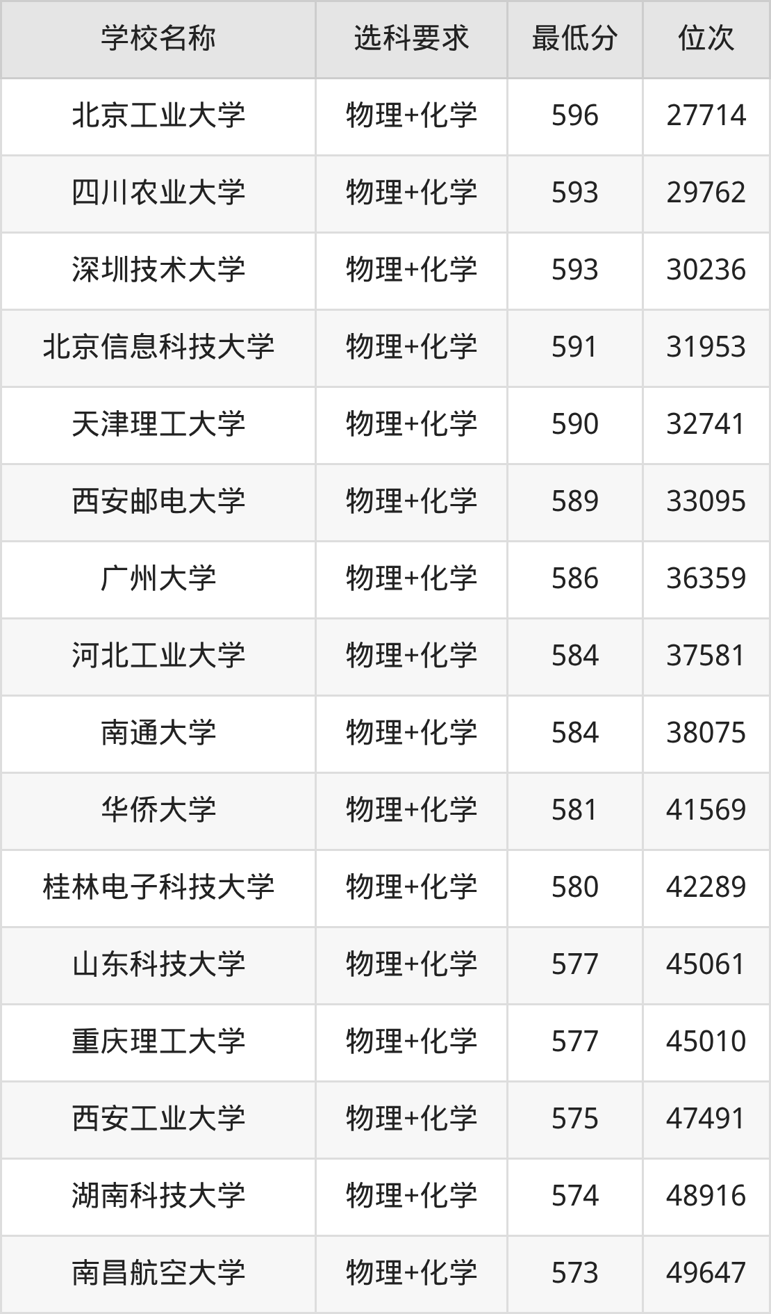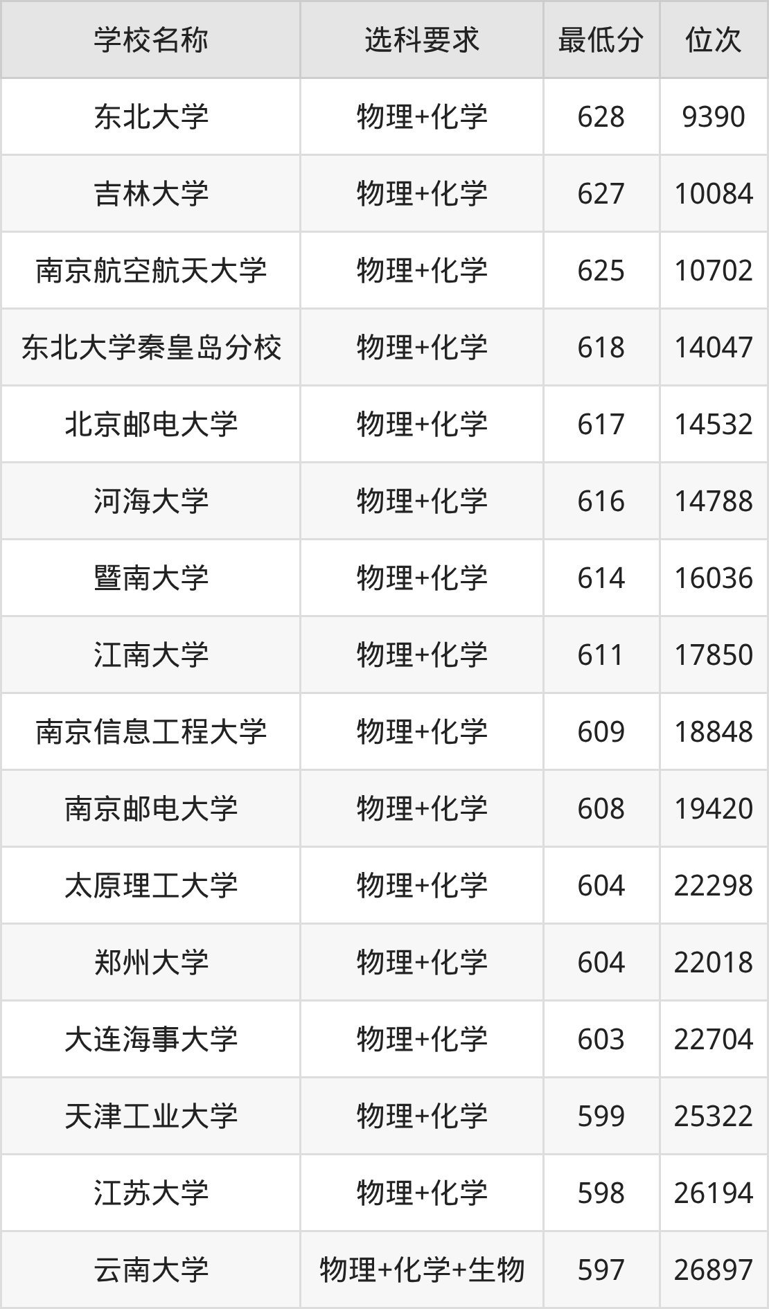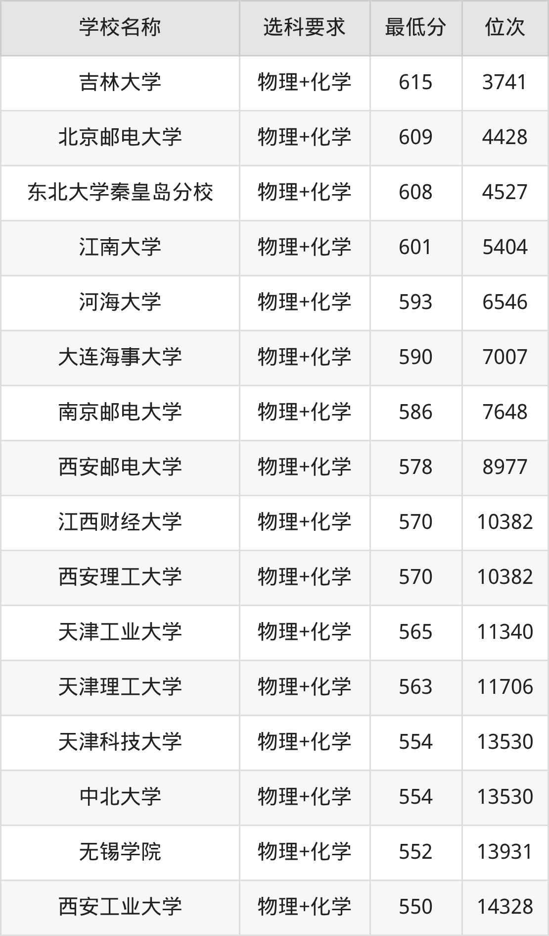 在吉林招生的院校中,有73所要求考生必选“物理+化学”,如吉林大学、北京邮电大学等。