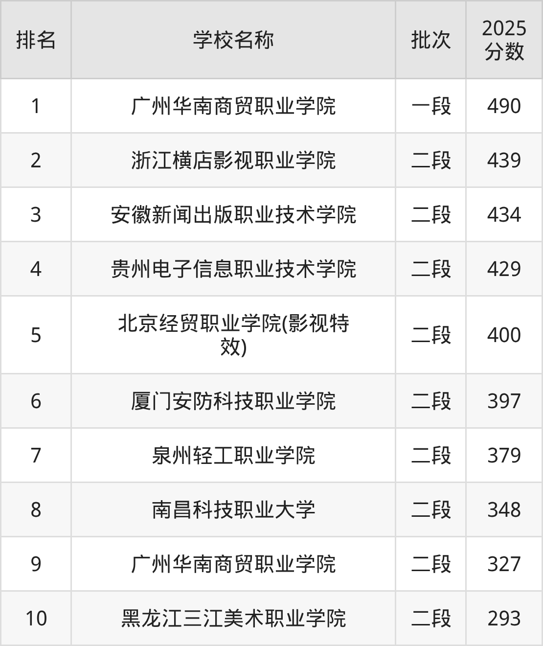 第1名:广州华南商贸职业学院,490分(一段);