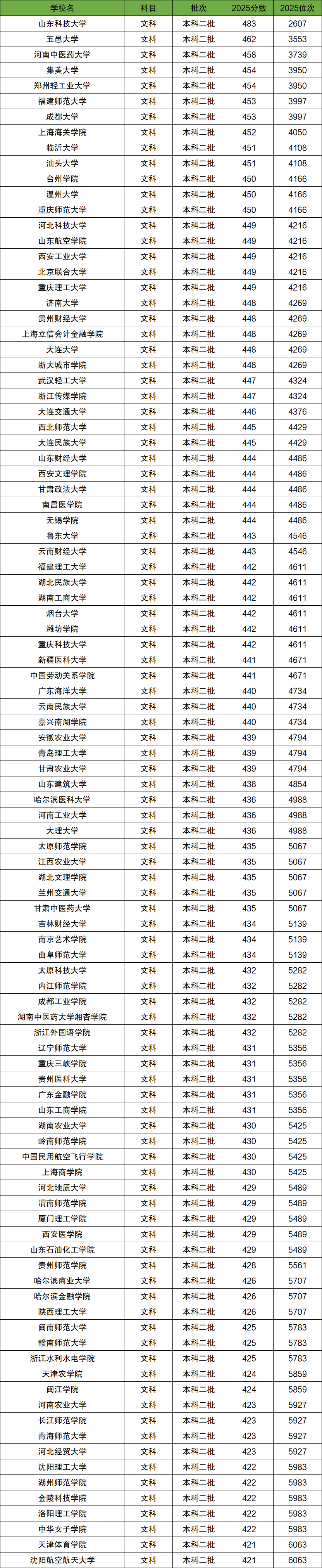 全国二本大学文科分数线排名前100名: