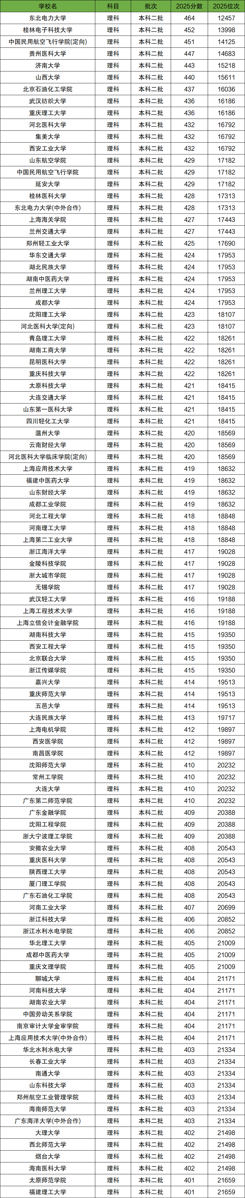 东北电力大学(464分)、桂林电子科技大学(452分)、中国民用航空飞行学院(定向)(451分)、贵州医科大学(447分)、济南大学(443分)、山西大学(440分)、北京石油化工学院(437分)、武汉纺织大学(436分)、重庆理工大学(436分)、河北医科大学(432分)。