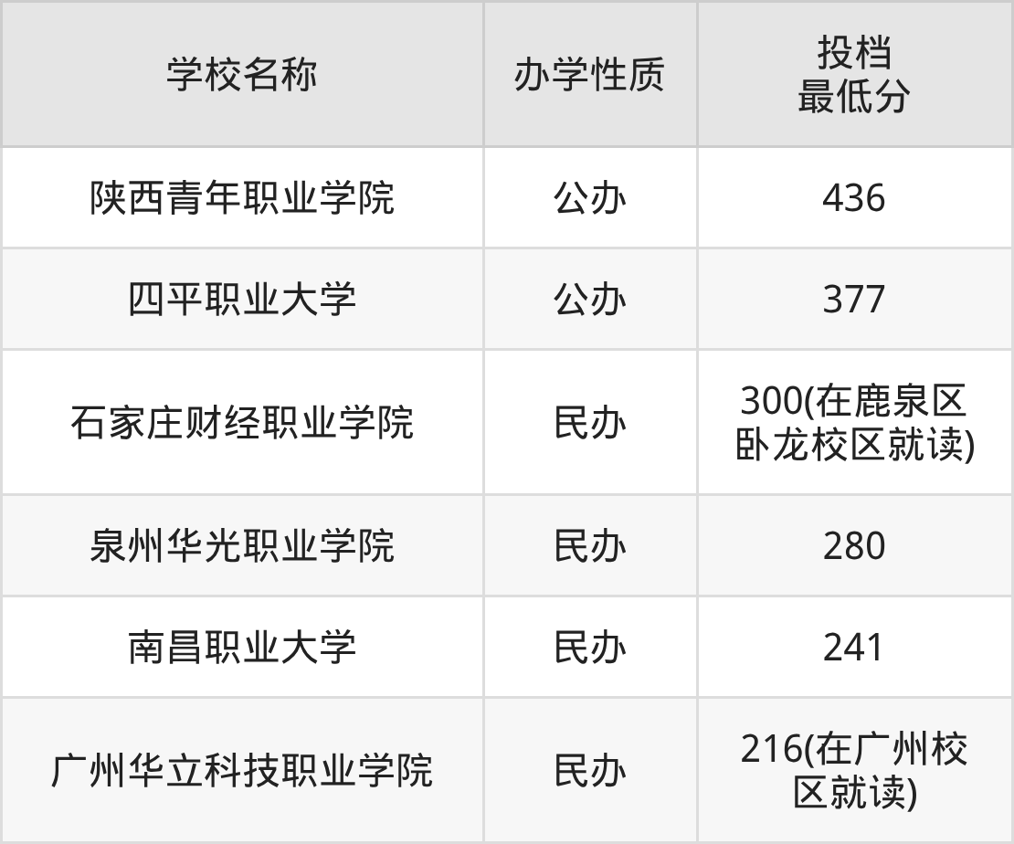 分数线最低、最好考的是广州华立科技职业学院,学校播音与主持最低分是216,超专科线16分,不过这所学校是民办性质。2025公办大学最低分是377,收分最低的学校是四平职业大学,超专科线177分能上。