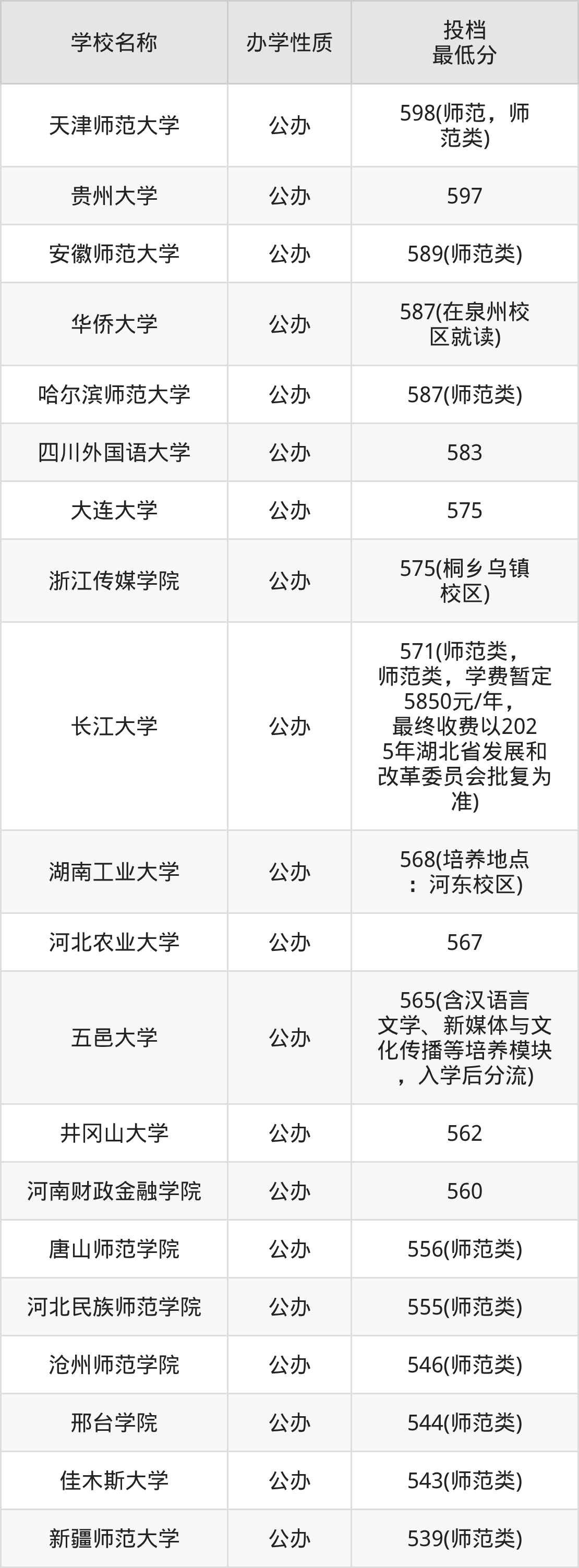 分数线最低、最好考的是上海立达学院,学校汉语言文学最低分是462,超本科线3分,不过这所学校是民办性质。2025公办大学最低分是519,收分最低的学校是浙江万里学院,超本科线60分能上。