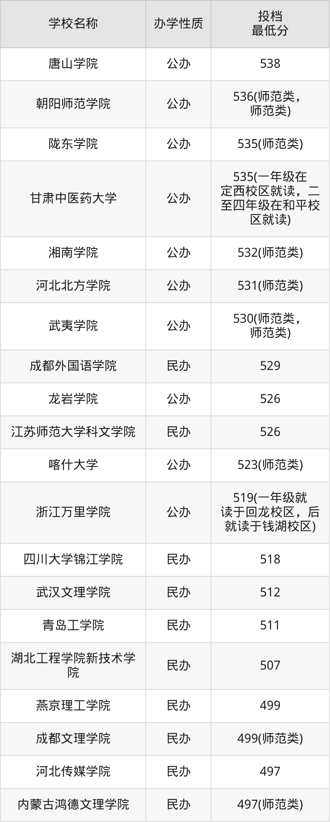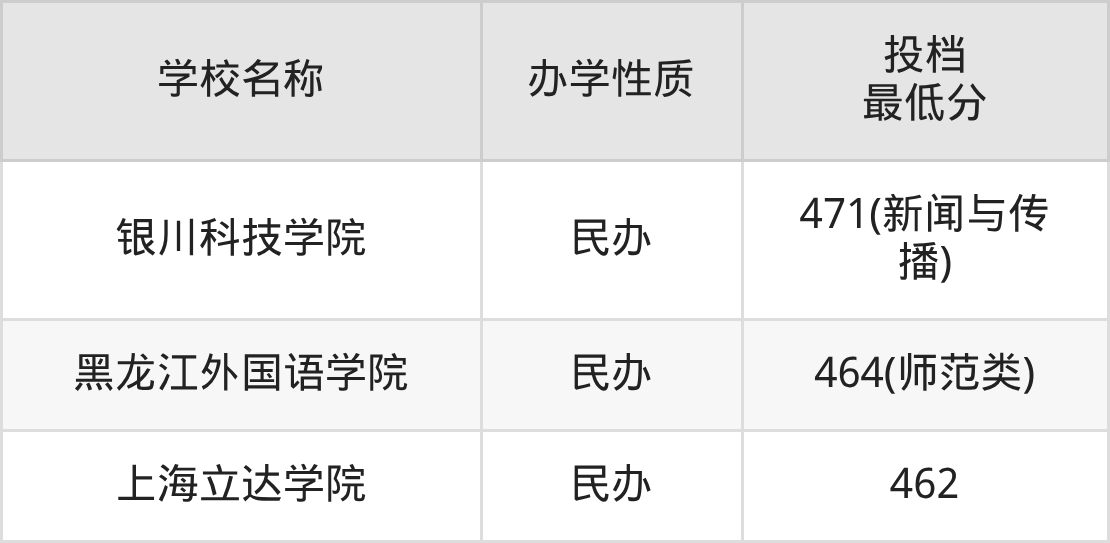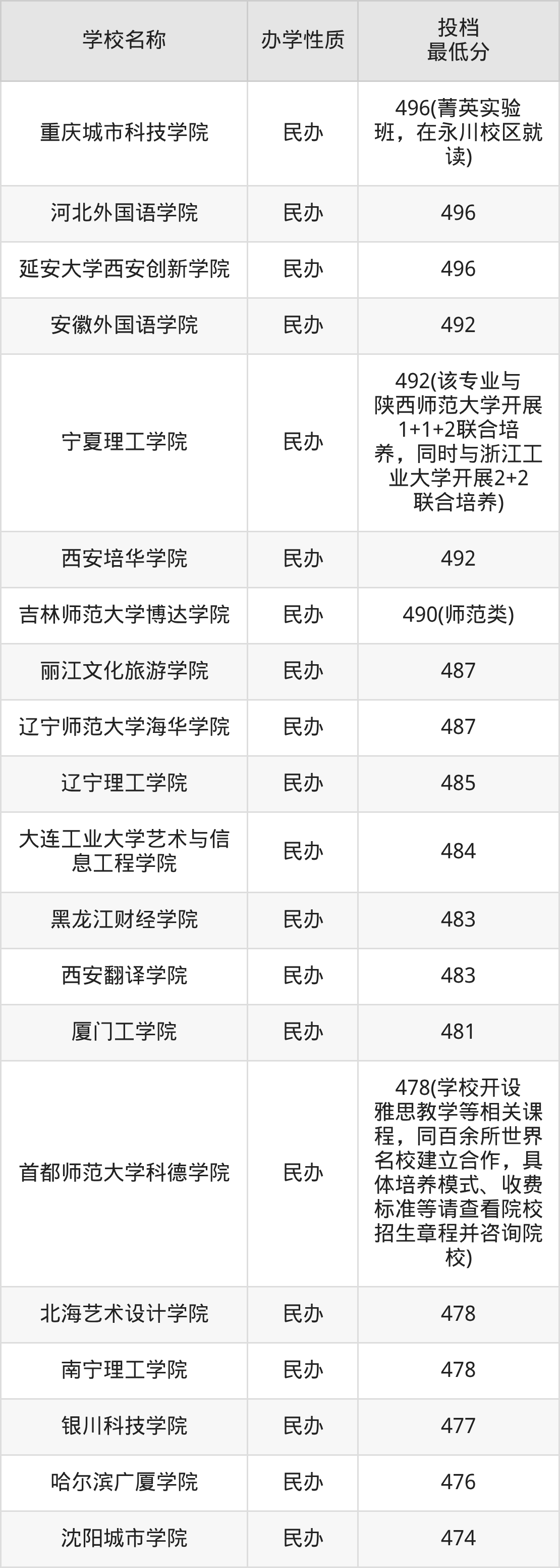 另外分数线比较低的大学还有黑龙江外国语学院(464分)、银川科技学院(471分)、沈阳城市学院(474分)、哈尔滨广厦学院(476分)、银川科技学院(477分)等。