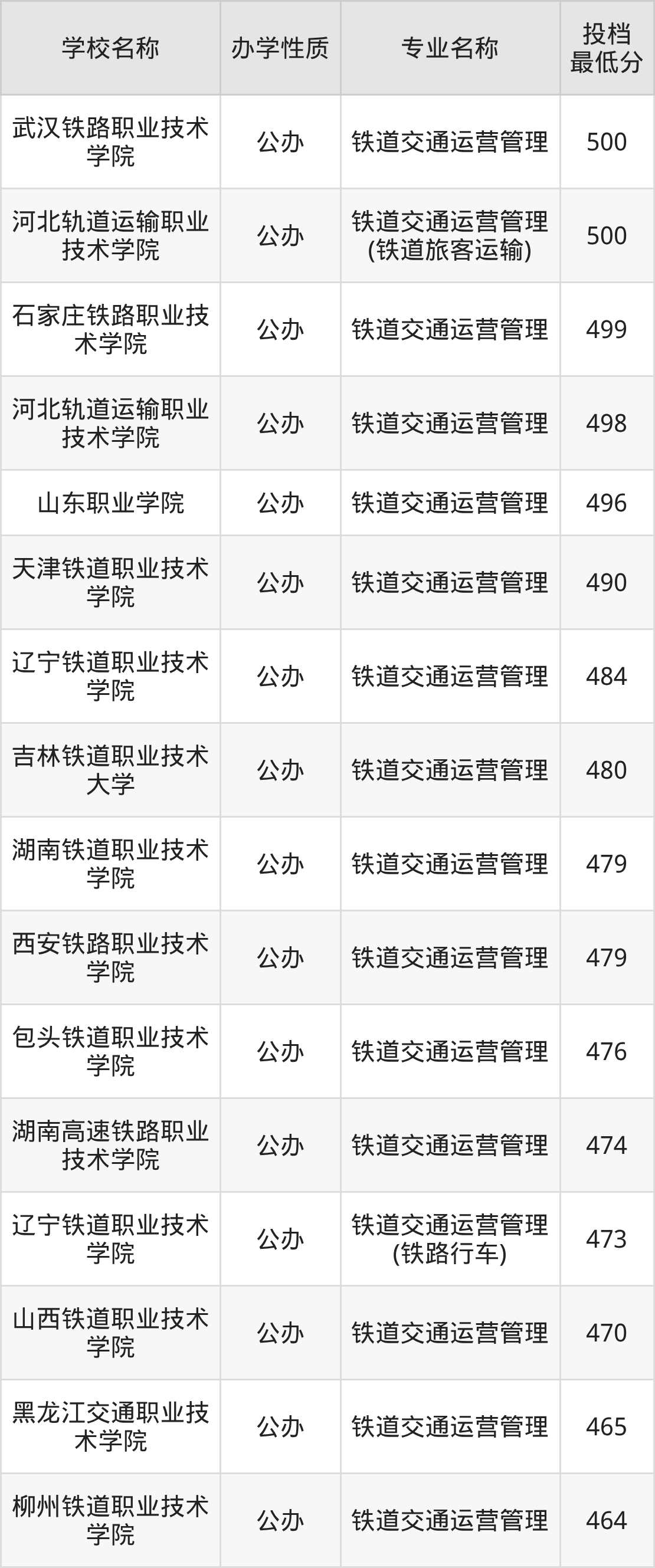铁道交通运营管理专业收分最高的大学是武汉铁路职业技术学院,2025年最低分500分,超专科线300分。分数线排名前五的大学还有:河北轨道运输职业技术学院(铁道旅客运输)500分、石家庄铁路职业技术学院499分、河北轨道运输职业技术学院498分、山东职业学院496分。