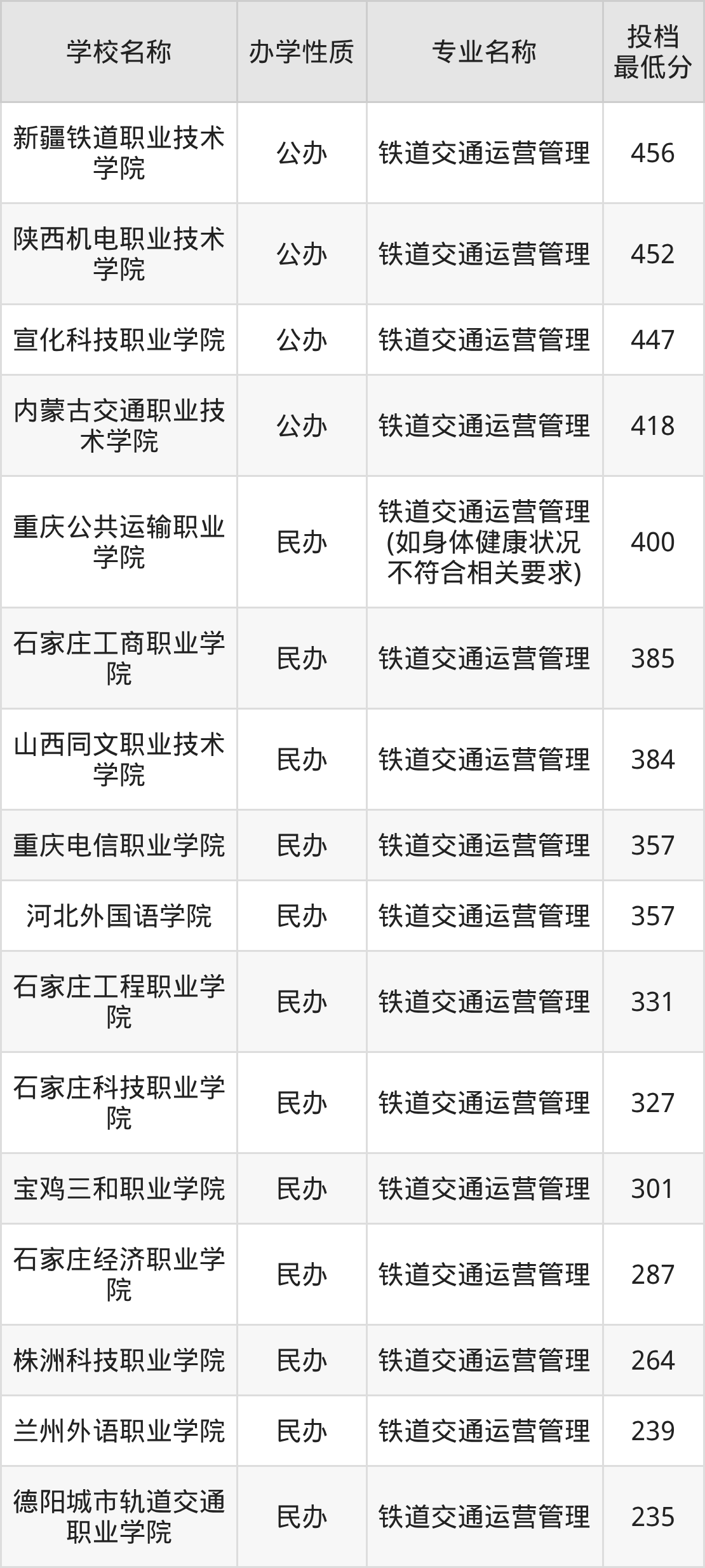 2025年铁道交通运营管理专业最低录取分数线位于235分到500分之间,收分最低的大学是德阳城市轨道交通职业学院。各校最低分如下。
